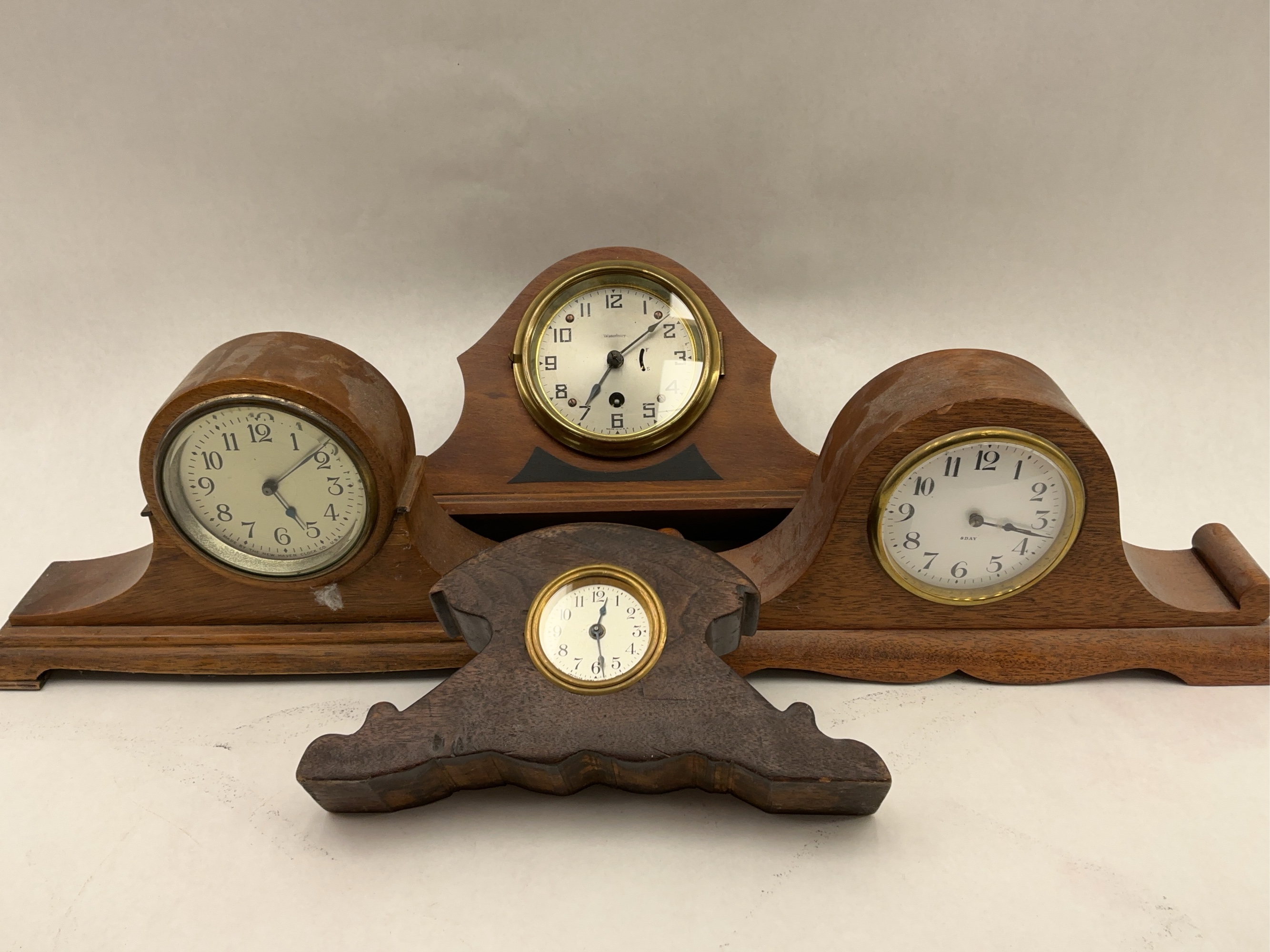 This lot features multiple mantle clocks, including examples from Sessions Clock Co., Waterbury Clock Co., and Wm. L. Gilbert Clock Co. These clocks are untested.