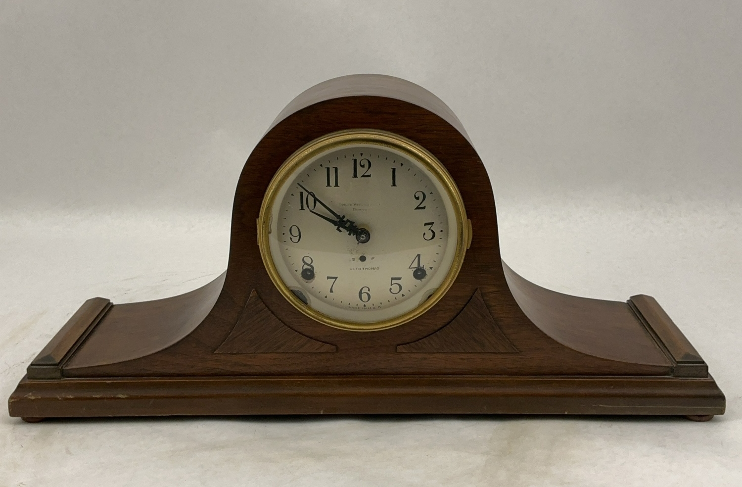 Wooden Seth Thomas mantle clock, with key and pendulum. The clock measures approximately 20 x 5 x 9 inches. It does tic tok.
