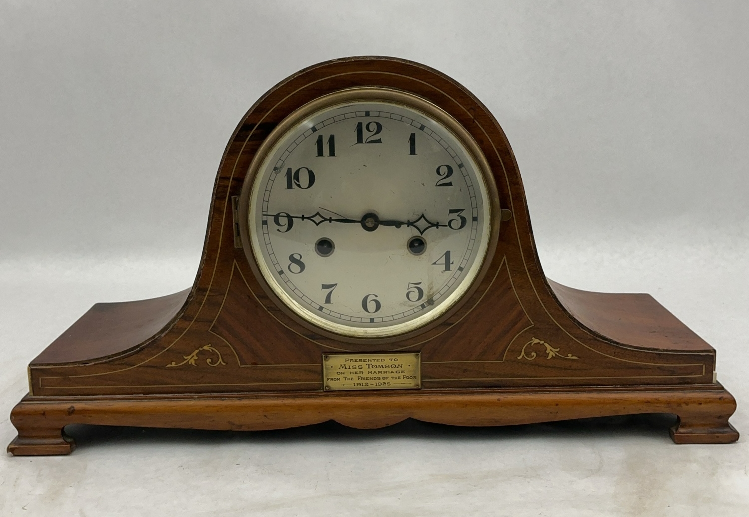 Wood mantle clock measuring 18 x 5 x 10 inches. Includes key and pendulum. Clock ticks.