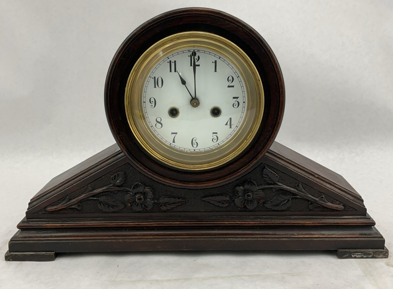 A Waterbury Clock Co. mantle clock crafted from wood. This piece measures approximately 17 x 4 x 11 inches and includes a key and pendulum. It is currently tic-tocking.