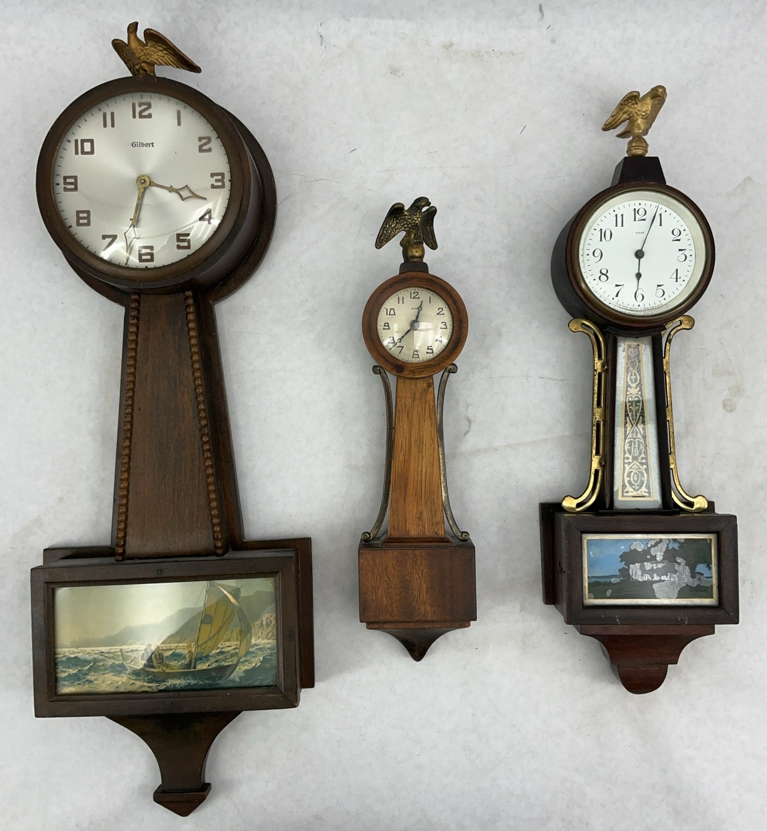 This lot features a collection of three banjo-style clocks. The clocks have wooden construction and decorative elements. Sizes vary from small to big 3 x 2 x 14 - 8 x 2 x 23.