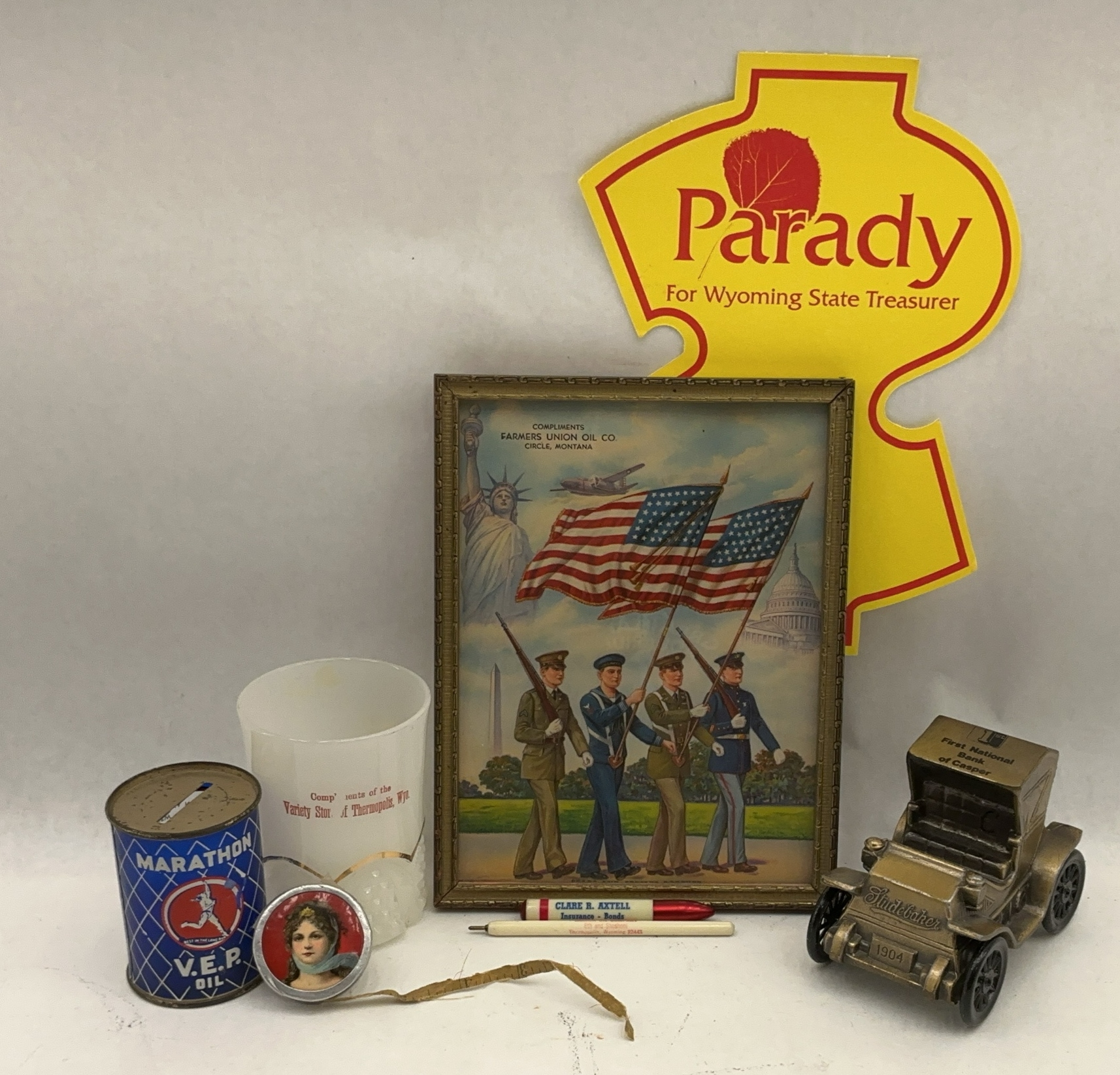 This collection includes a framed print (9x7 picture) from Farmer's Union Oil Co. Circle, Montana, a First National Bank of Casper Studebaker 1904 coin bank by Banthrico Inc., and other advertising memorabilia.