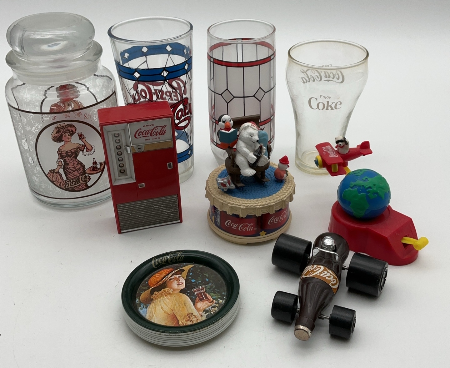 A collection of various Coca-Cola and Pepsi-Cola memorabilia. The assortment includes several glasses with Coca-Cola and Pepsi-Cola branding, a glass jar with a Pepsi-Cola design, a Coca-Cola musical piece featuring polar bears, and a transistor model TRS 618 replica of a Coca-Cola vending machine, along with other interesting trinkets.