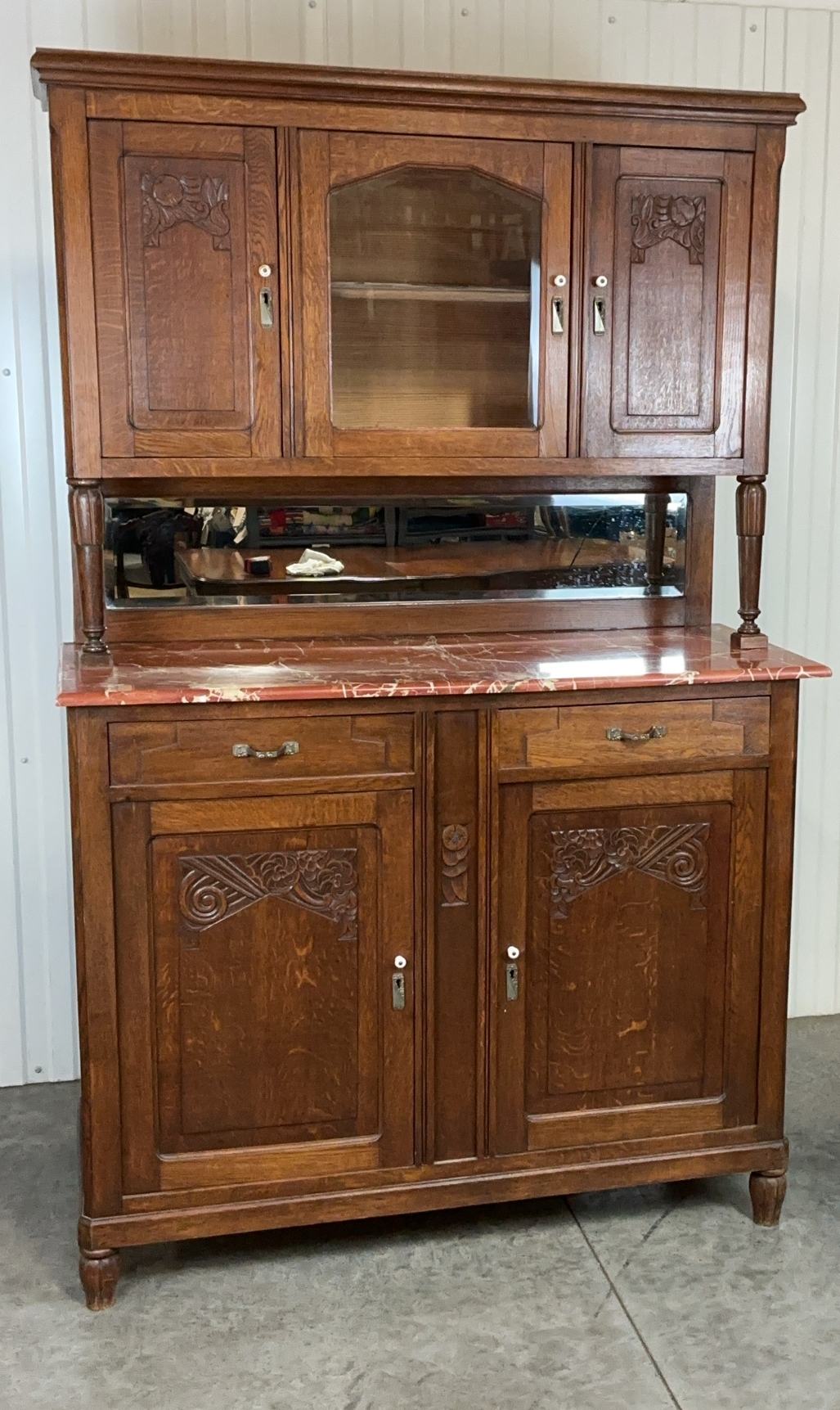 Wooden buffet featuring glass-fronted cabinets above and enclosed cabinets below. The buffet has a marble top with a full length crack. Measures approximately 28 1/2” X 48 1/2” X 77”.