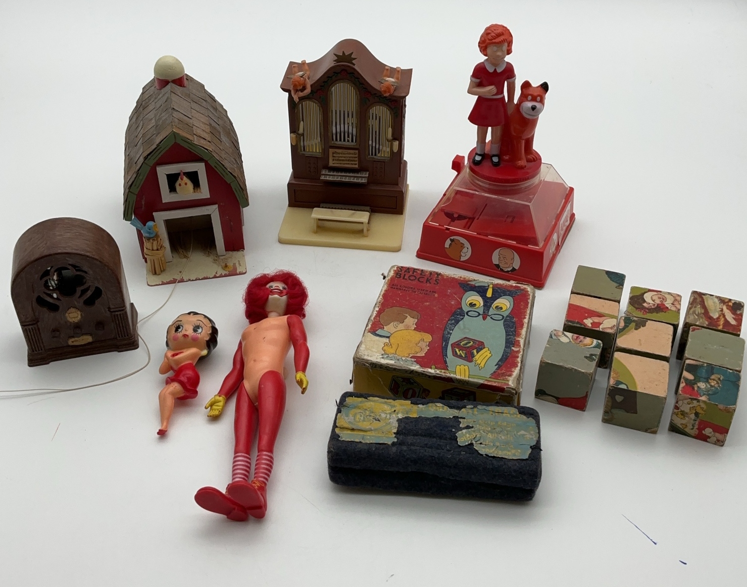 This lot features an assortment of items, including a McDonalds Remco figure dated 1976, an Enesco D.J.'s Music Box LTD barn and organ dated 1985, and an Annie figure. Other items include a Betty Boop figure, wooden blocks, and a toy radio.