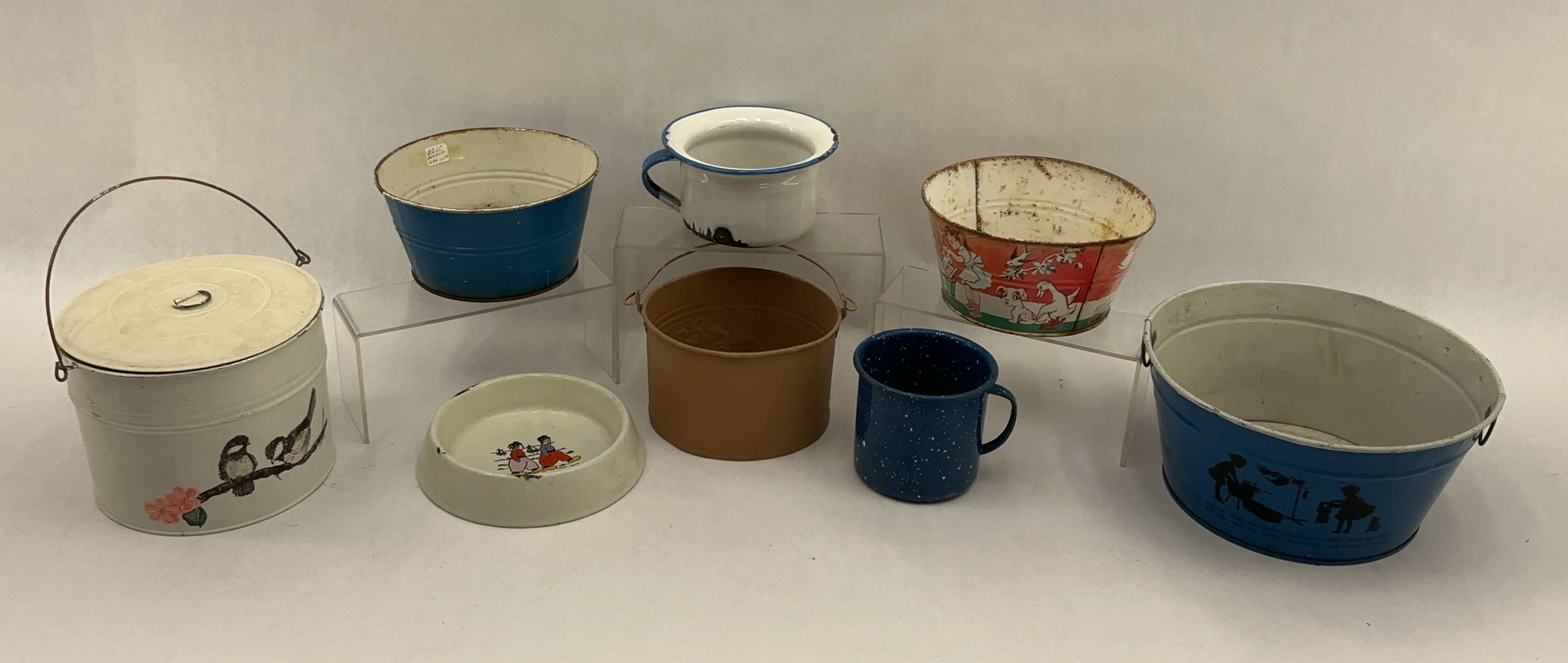 This lot features a variety of enamelware items, including several buckets/tubs, mugs, and a dish. There's a blue bucket with a silhouette laundry scene, a bucket featuring birds, a German dish with a Dutch couple design, and several mugs in varying conditions.