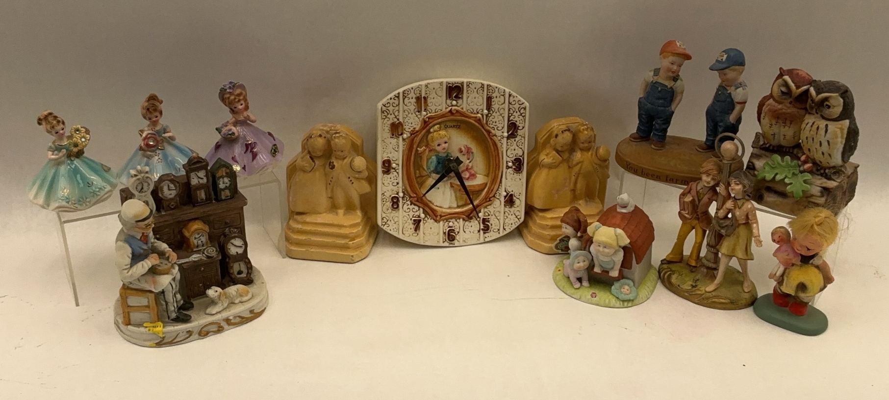 Collection of figurines, featuring Josef Originals, Xavier Roberts Cabbage Patch Kids, and other decorative pieces. Includes a clock, measuring 7x2x8.