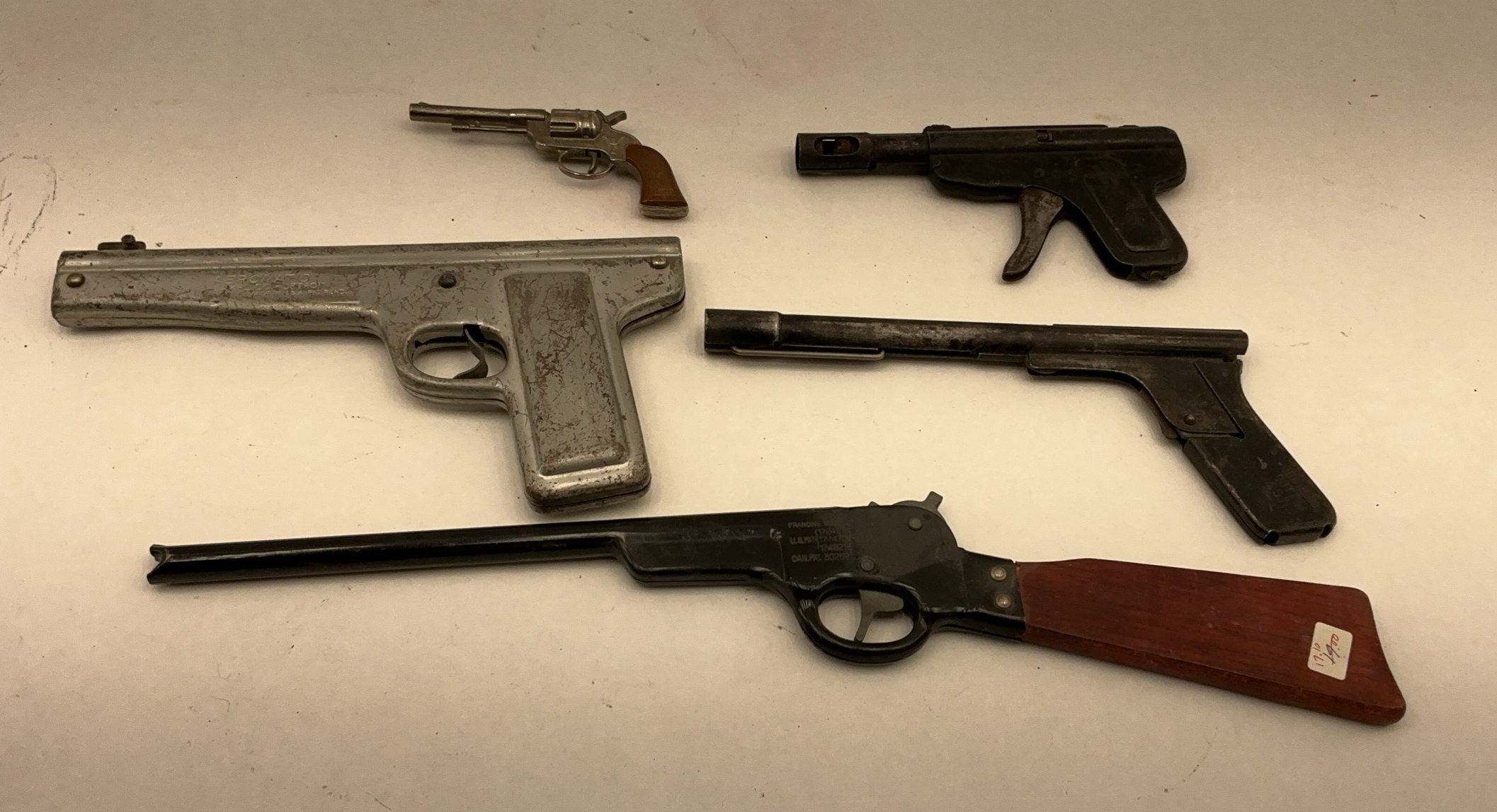 This lot features five die-cast metal and pressed steel toy cap guns from various American manufacturers. Included is a lever-action rifle with a wooden stock and die-cast metal assembly, marked "AEROMATIC J.KELLER & CO. DETROIT MADE IN U.S.A. PAT PEND" and has a functional lever action. Also included are AEROMATIC J.KELLER & CO. DETROIT MADE IN U.S.A. PAT PEND automatic pistol, A submachine gun with "METAL PRODUCTS WINDOM MINN M.F.G. CO." markings on the grip panel and "Mini Rayo" revolver displays Canadian Patent 302691.