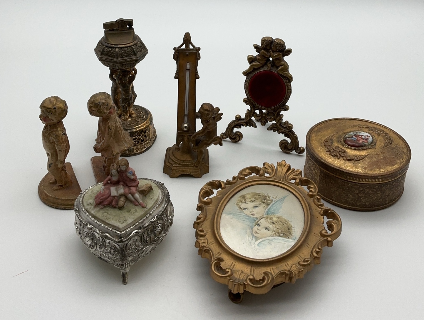 This lot includes a collection of decorative metal items. There is a lighter supported by cherubs, a thermometer, a picture frame, two figurines, and two jewelry boxes. One frame has a 'Princess Art GES Gesch' mark, Made in Western Germany on the back.