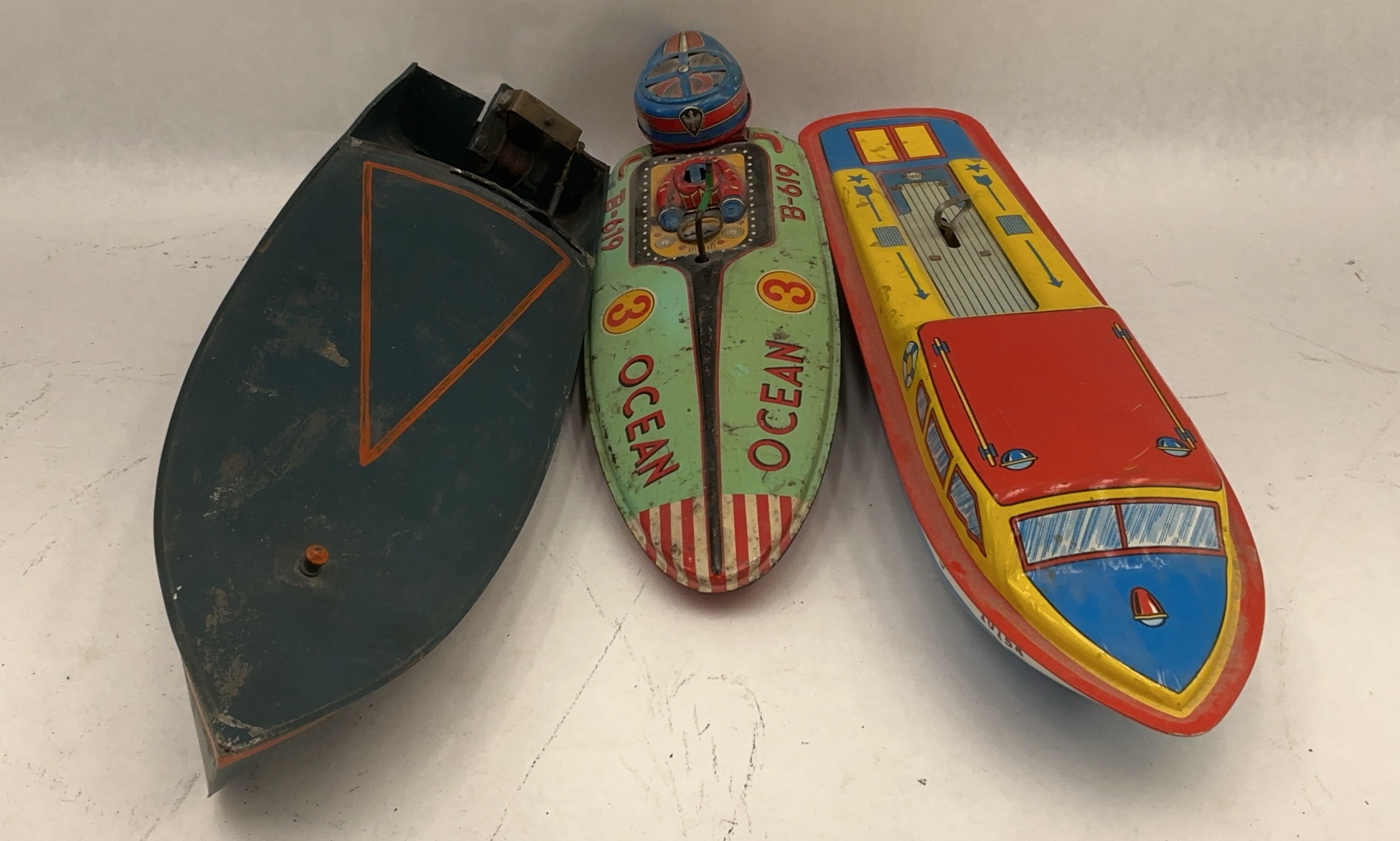 This lot features three tin toy boats from the 1940s-1960s, representing both American and Japanese toy manufacturing from the mid-20th century. The collection includes wind-up powered speedboats with colorful lithographed details and simple painted designs, showcasing the evolution of toy boat design from elaborate pre-war lithography to streamlined post-war production methods. The largest boat features yellow superstructure with red and blue accents, displaying detailed lithographed cabin windows and porthole details. Hull marked "10154" with blue lower hull and white waterline stripe. Construction shows tin body with wire steering wheel detail on cockpit and clockwork wind-up motor mechanism. Marked "THE OHIO ART CO BRYAN OHIO" with "MADE IN U.S.A." on hull underside and is 14x4x3. A Japanese-made speedboat displays light green hull with red and white striped bow section, marked "OCEAN" in red lettering with "B-619" designation and circular "3" emblems and is 12x5x3. The boat features detailed lithographed cockpit with racing driver figure, wire exhaust pipe detail, and blue with orange trim helmet-shaped engine cowling. Marked "MADE IN JAPAN" with "IB" maker's mark in rectangular cartouche on hull underside. Construction shows wind-up motor with simple tin body assembly. The third boat features streamlined design with blue-grey painted finish and orange pinstriping trim forming simple V-shaped graphics on deck and hull and is 14x5x3. Simple painted construction with black metal smokestack or engine detail mounted behind cockpit opening. Wind-up motor mechanism visible in stern section with key slot access.