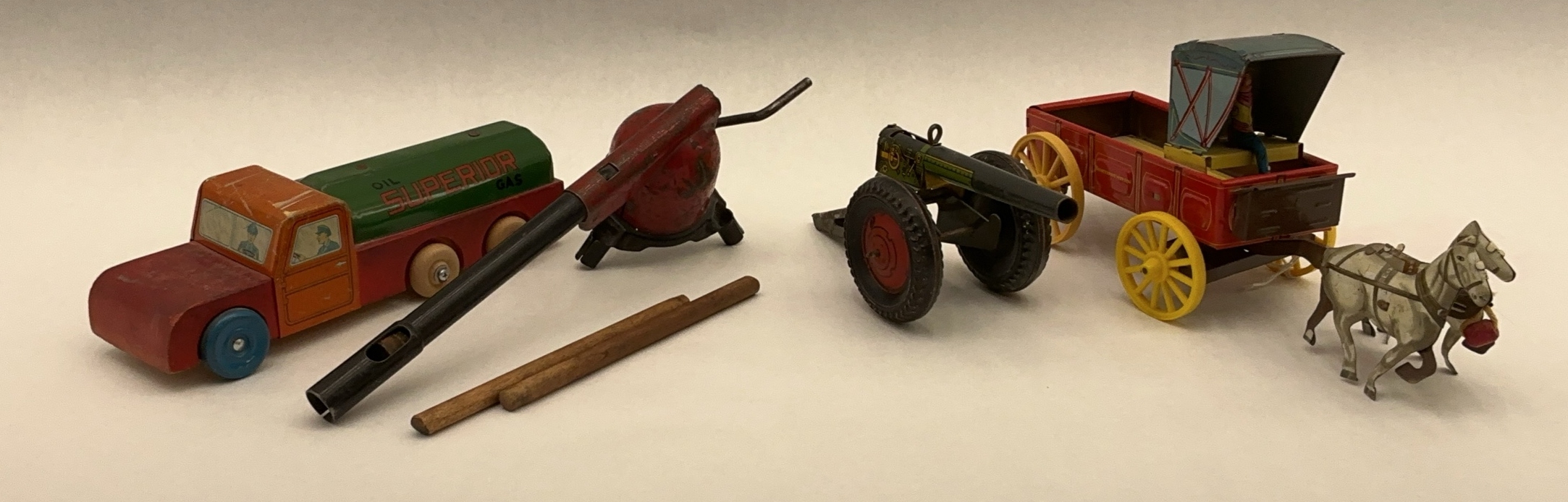 This lot includes a Northwestern Products horse-drawn wagon toy, a Superior Oil tanker truck, and an unidentified toy cannon. The wagon is marked 'Northwestern Products Co., St. Louis, MO'. All are made of wood and metal.