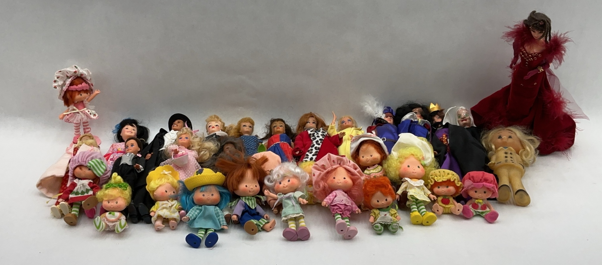 Collection of dolls including Disney characters like Snow White, the Evil Queen, Prince Charming, and possibly other character dolls. Also includes Strawberry Shortcake dolls and what appears to be a Scarlett O'Hara doll. Makers may include Mattel and other manufacturers.