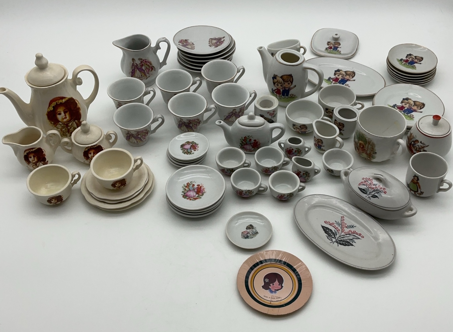 Collection of toy tea sets and individual dishes. Makers include: F.A.O. Schwarz, Made in Japan, Made in Germany, and Made in Hong Kong.