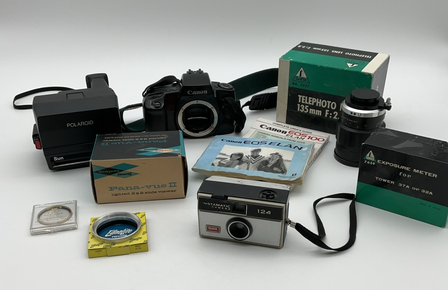 A collection of camera related items. Included is a Polaroid Sun 640 Land Camera, a Canon EOS Elan 100 Camera with the Canon EOS Elan user's guide, a Sawyers Pana-Vue II lighted 2x2 slide viewer, and an Ednalite Precision Filter Holder and a Gold Heritage filter in its case, and a Tower 37A GP 32A exposure meter with its case.