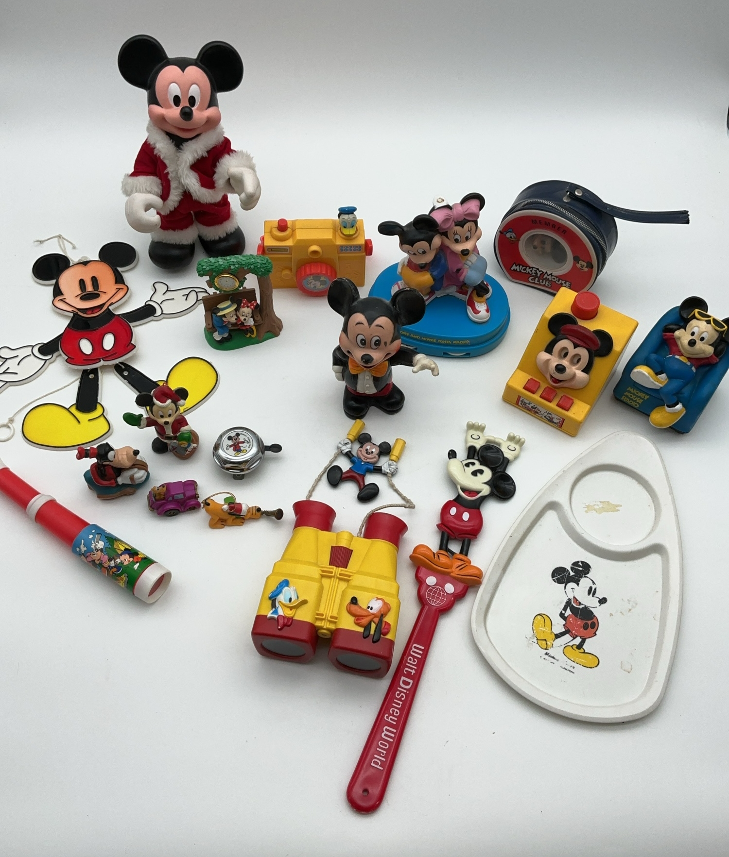 Collection of Disney character collectibles featuring Mickey Mouse, Donald Duck, and Pluto. Includes binoculars manufactured by Illco Toy, Walt Disney Company made in Thailand. Also includes a Mickey Mouse figure marked Walt Disney Productions and made in Korea. A child's plate manufactured by Eagle made in USA. A Walt Disney World spoon is included as well.