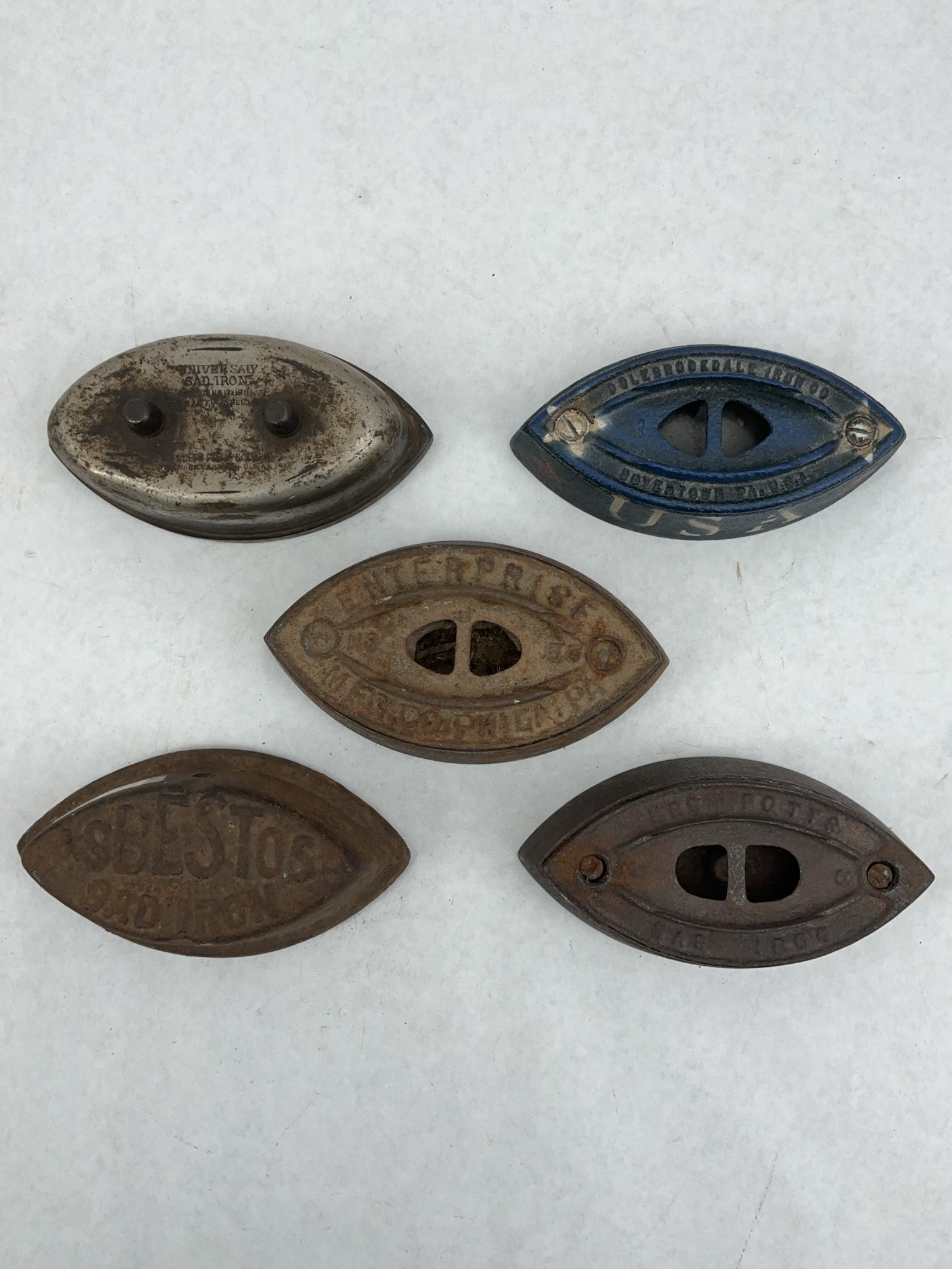 Collection of five sad irons including one Universal Sad Iron by Landers, Frary & Clark, New Britain, Conn. USA. Other irons by Enterprise, Boyertown, PA, and Brookdale Iron Co. Asbestos Sad Iron also included.