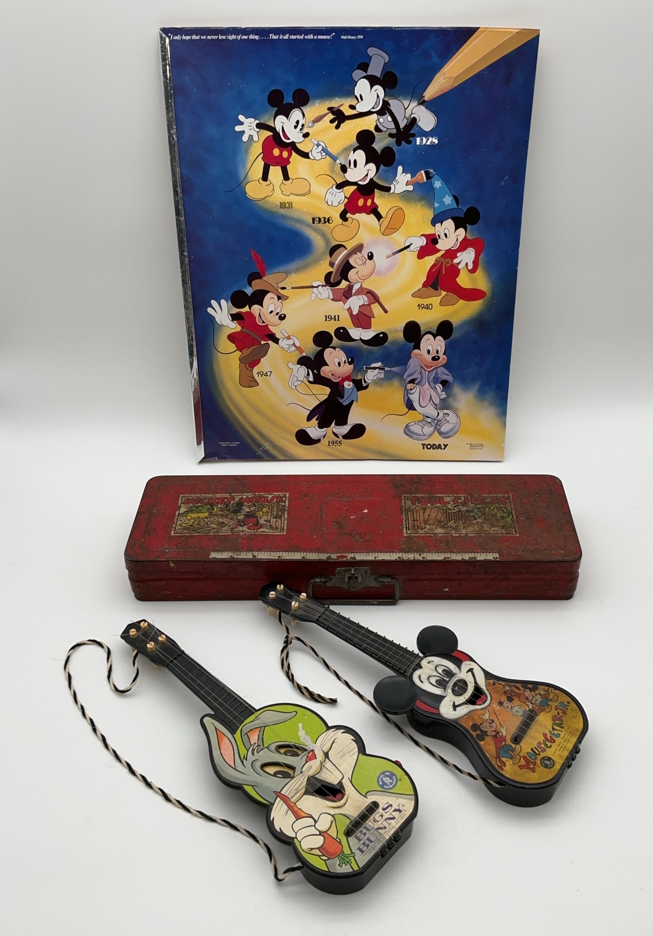 Disney Mickey Mouse Evolution Poster, Climax Tool Chest, and Mattel Toy Guitars