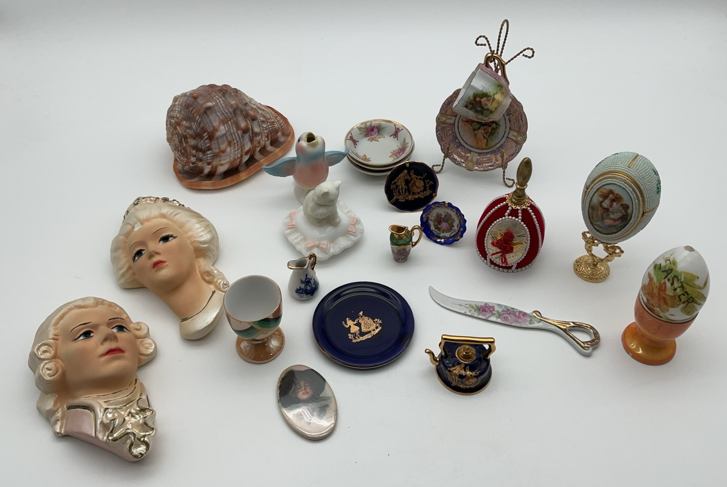 A charming collection of miniature collectibles. This lot includes a variety of items such as decorative plates, figurines, and more. Makers include Limoges, OTCO, Made in Japan, and Dorothy Lower. Size of items vary from 1x2 to 7x4x2.