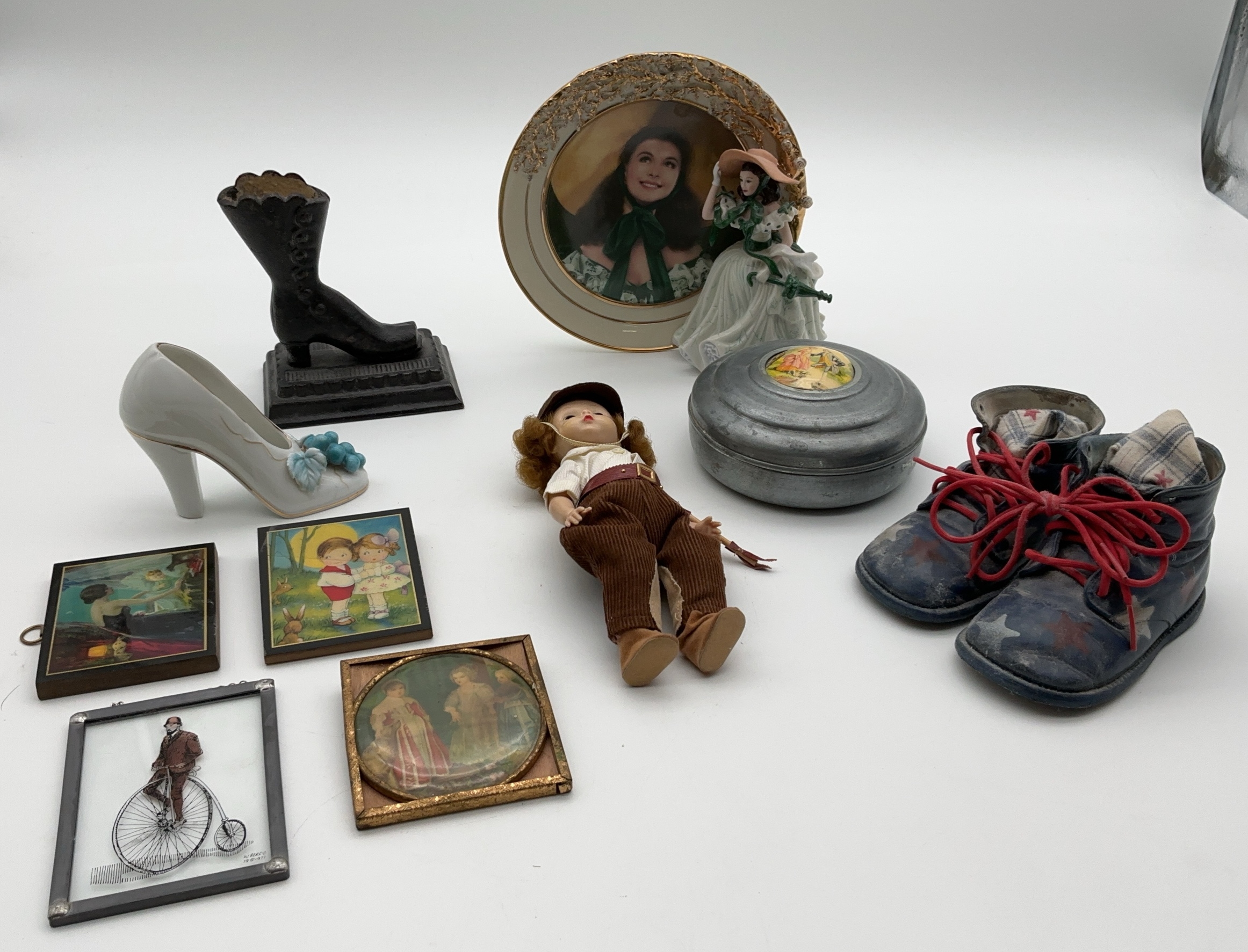 Assorted Collectibles Group: Doll, Shoe Figures, Pictures, Metal Container