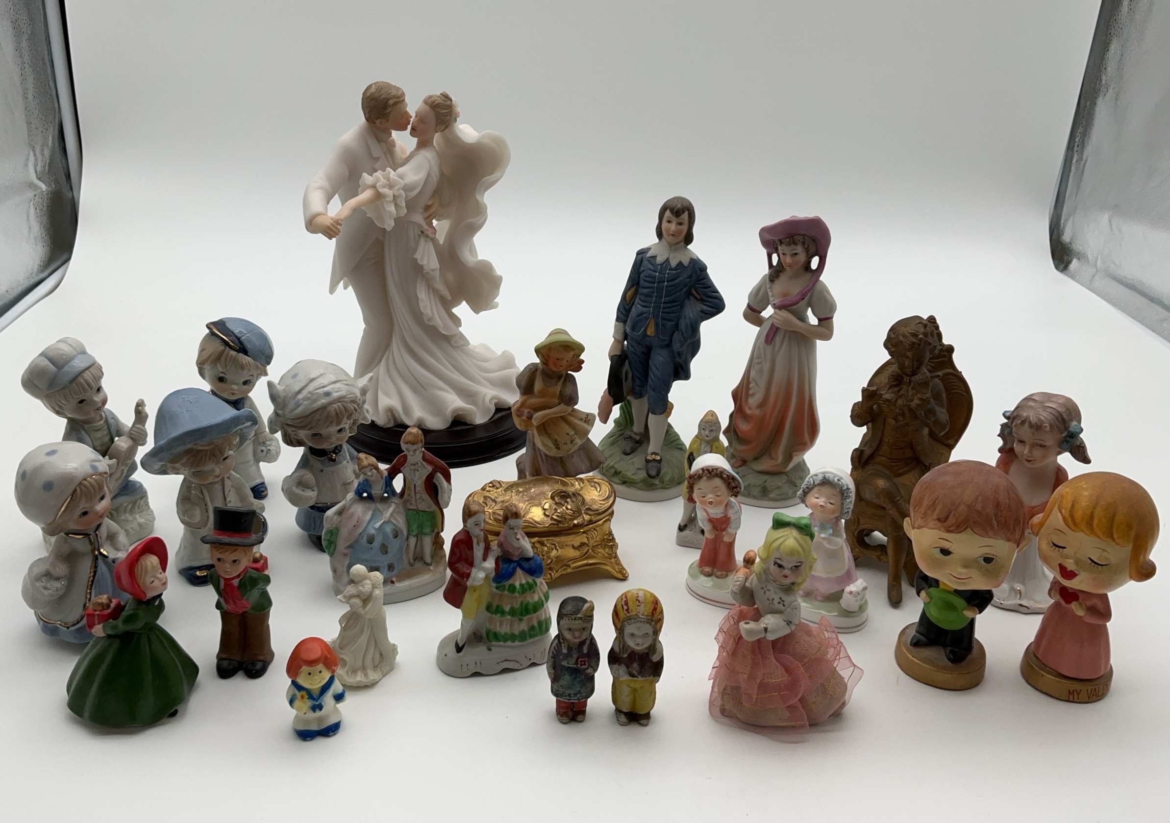 A group of various figurines. Included in this collection are porcelain figures by Cresco and FBIA. Sizes of items vary from 2x1 to 6x6x10.
