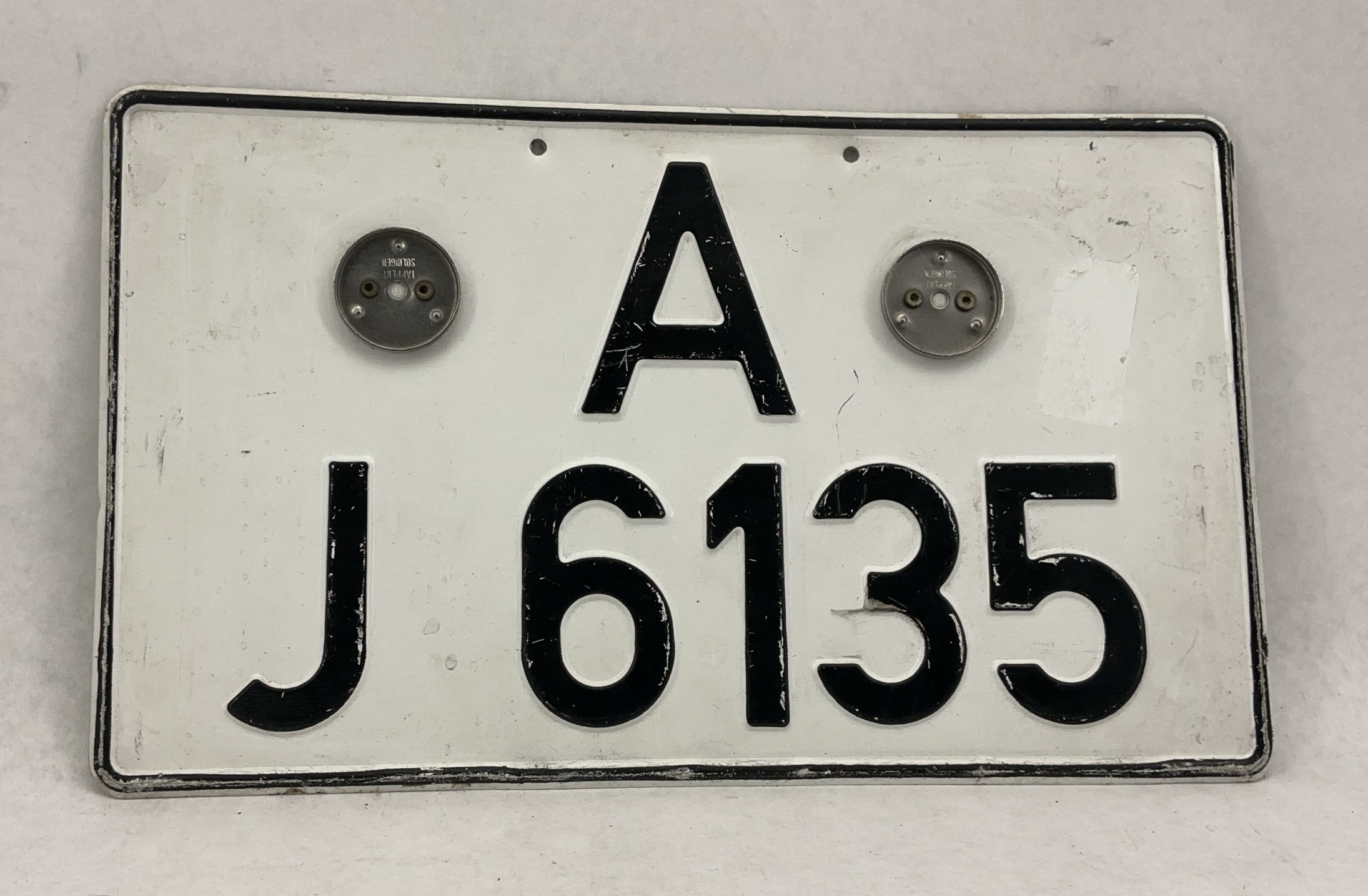 Old German license plate. The plate reads A J 6135, and has a Tappe Solingen maker's mark. Measures 13.25 x 8.