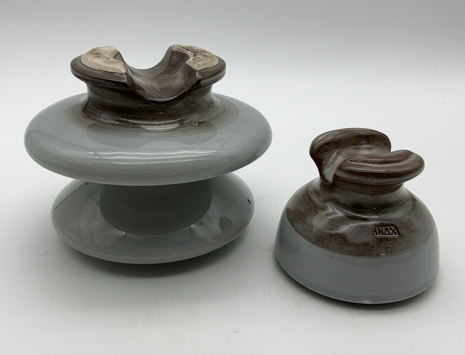 This listing features two ceramic electrical insulators. The larger insulator, made by Locke, has a diameter of 8 inches and is 6 inches tall. The smaller insulator is marked Knox, with a diameter of 5 inches and a height of 4 inches. These ceramic pieces would make interesting additions to a collection.