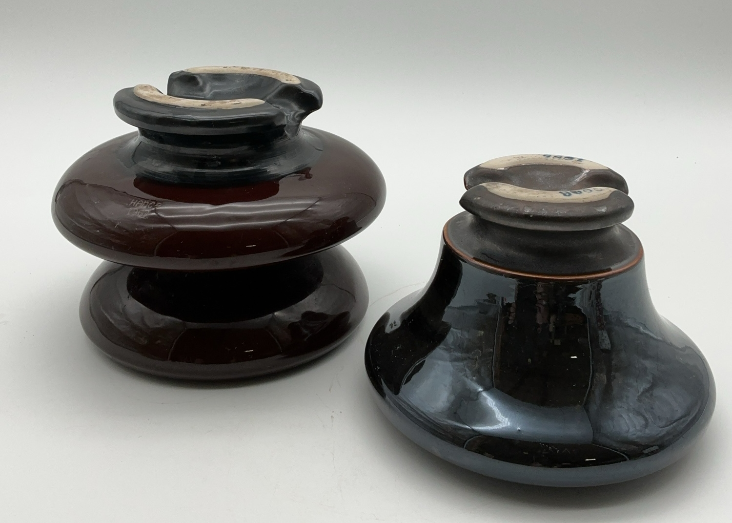 Two insulators, one 7 inch diameter, 5 inches tall and the other is 8 inch diameter and 6 inches tall. One marked "Chance 1967" and "9881"