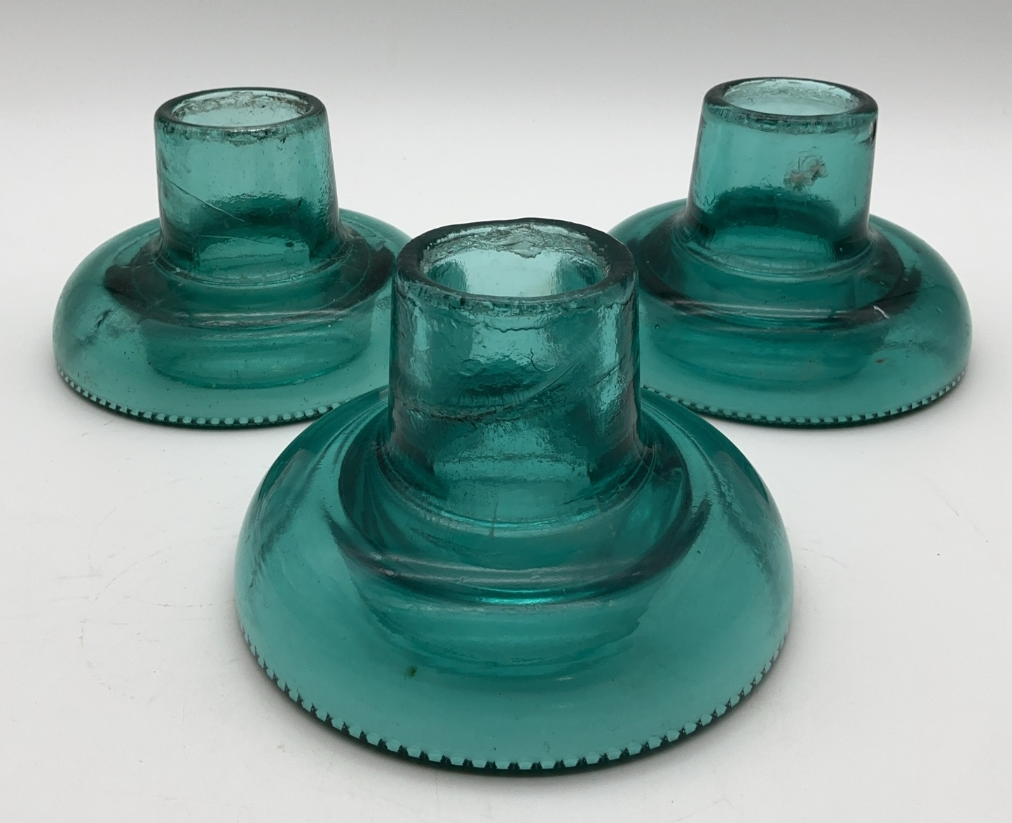 Grouping of three clear, turquoise-colored glass insulators. Each measures approximately 7 inches in diameter and 5 inches tall. Unbranded.