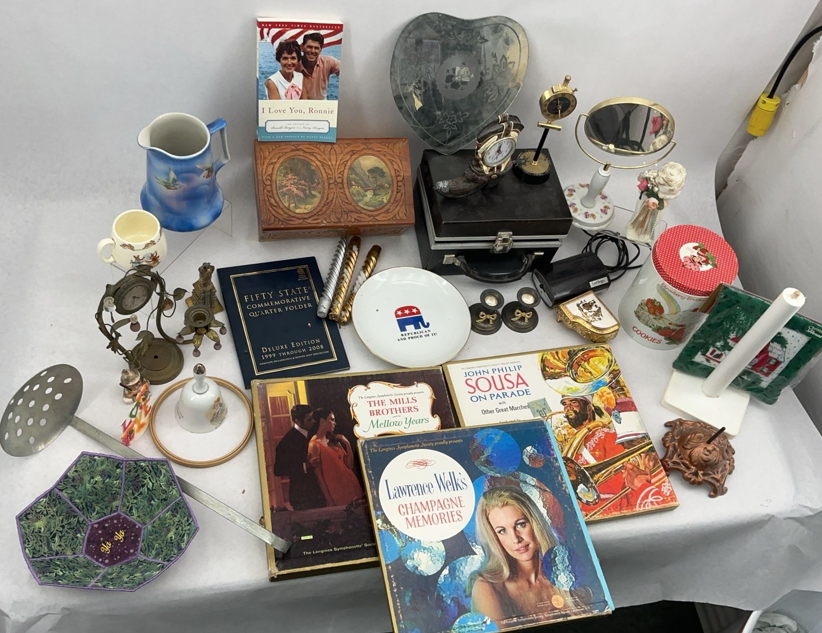Mixed lot 3 with records including Longines Symphonette Society, John Philip Sousa on Parade, The Mills Brothers, and Lawrence Welk's Champagne Memories. The coin folder commemorating fifty states, 1999 through 2008 is empty. Also includes the book, I Love You, Ronnie. Includes a commemorative Republican Party plate and a variety of household decor items.