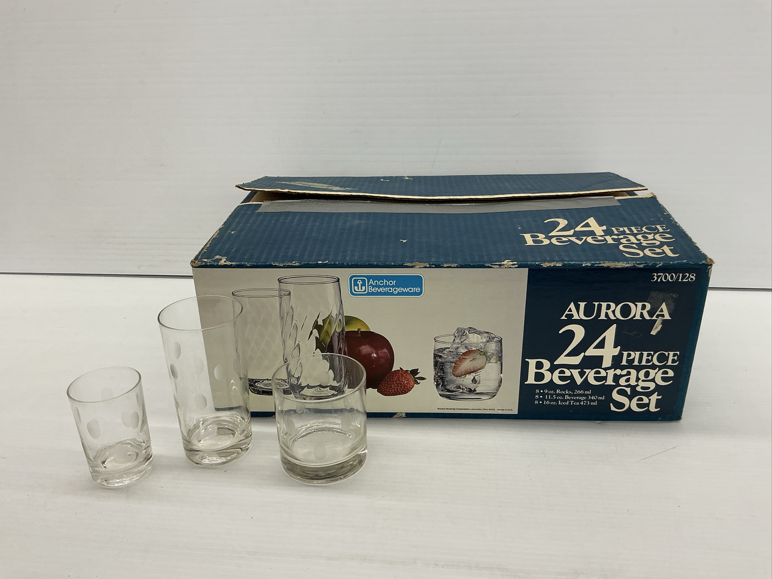 This listing is for a 21-piece Anchor Hocking Aurora beverage set. The set includes three different sizes of glasses, the set is missing three glasses.