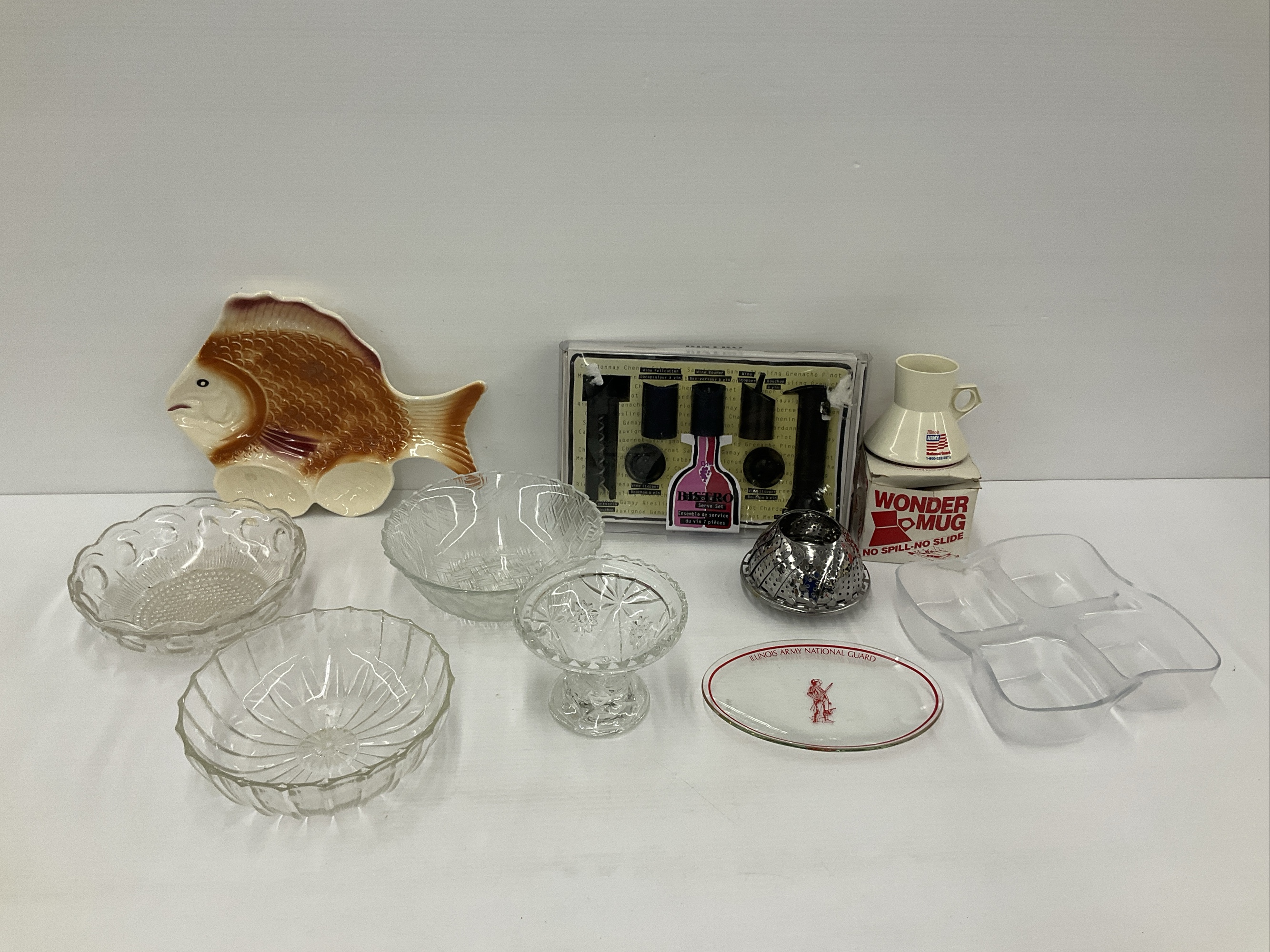 This group includes a variety of kitchen-related items. There's a new Bistro 7-piece wine set, clear glass bowls and pedestal dish, a fish design dish, a 'Wonder Mug', a small dish with a National Guard design, and other items.