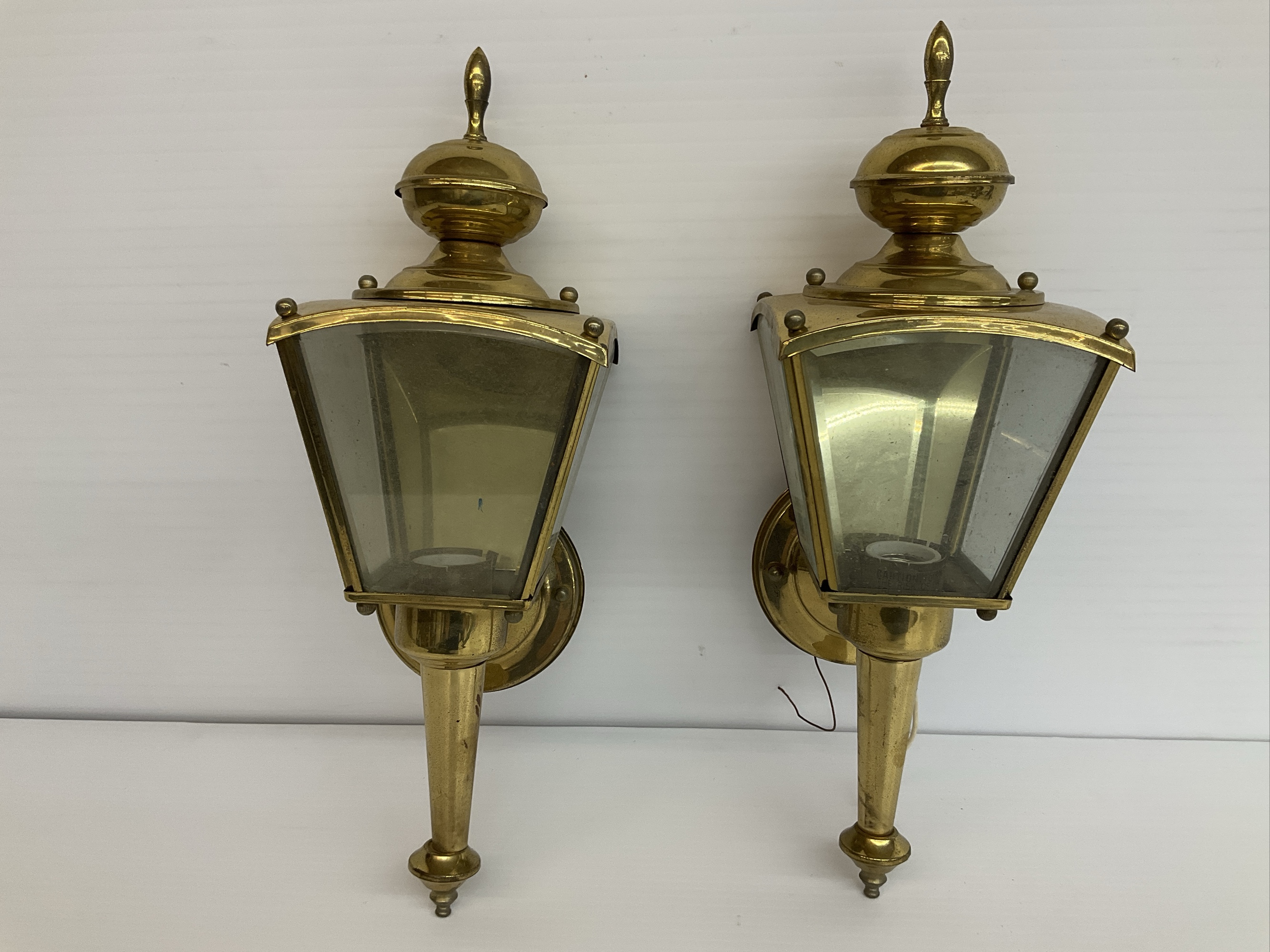 This is a pair of brass wall mount light fixtures. They have glass sides and are suitable for wet locations. The fixtures are wired for incandescent bulbs. 16 in. tall