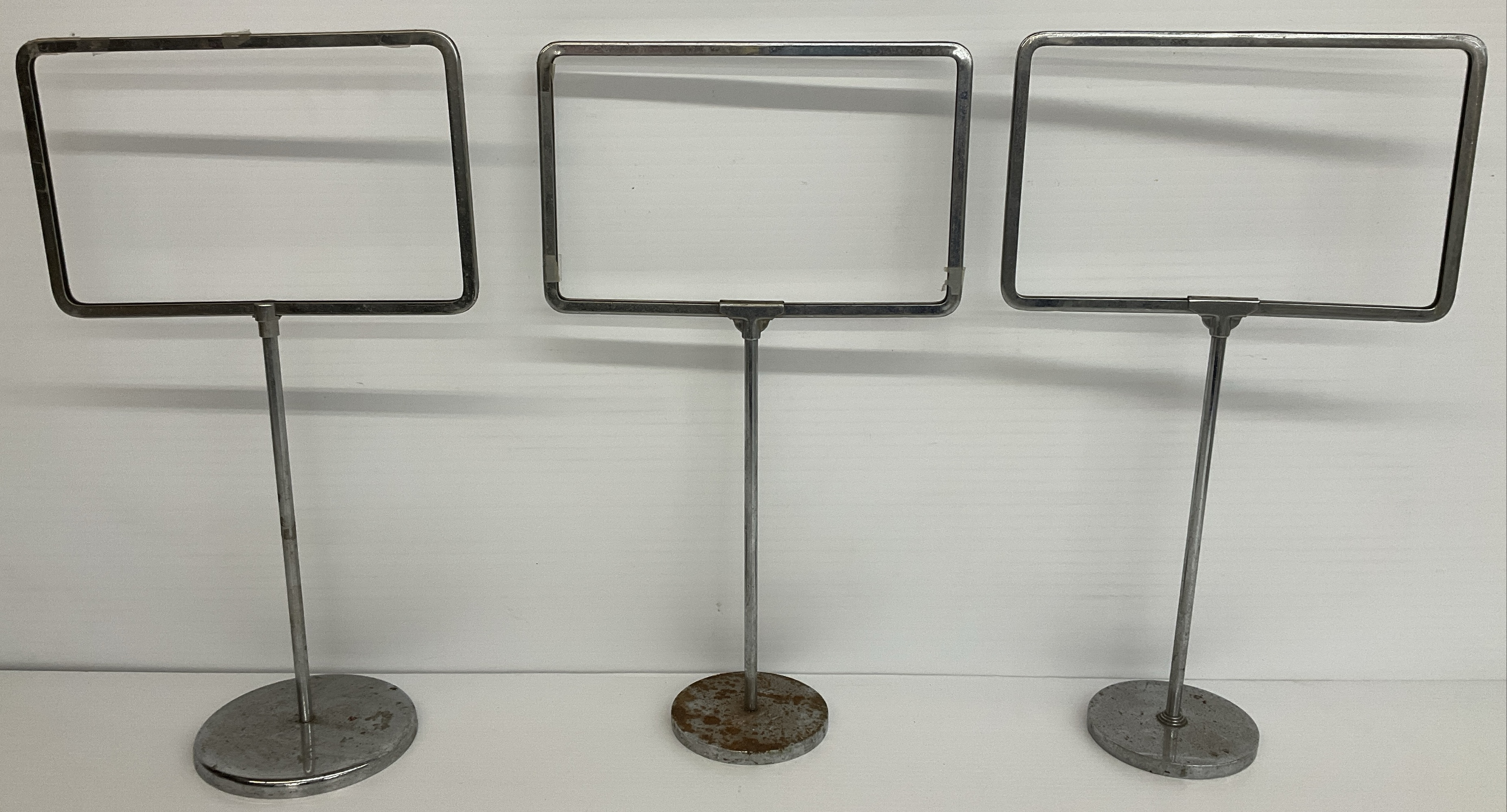 This lot features three sign holders with a metal base and a square metal frame at the top. Great for displaying menus, pricing, or advertising. 19.25 in. tall. Sign opening 7.25 x 11.25 in.