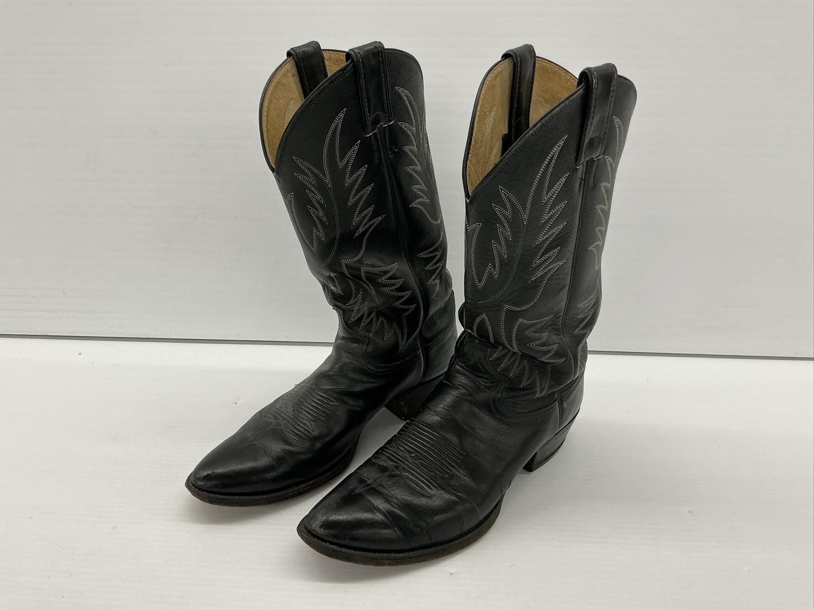 Pair of Justin brand black leather cowboy boots. Features decorative stitching throughout the shaft and vamp. Marked size is not visible. Style number 2041 marked inside.