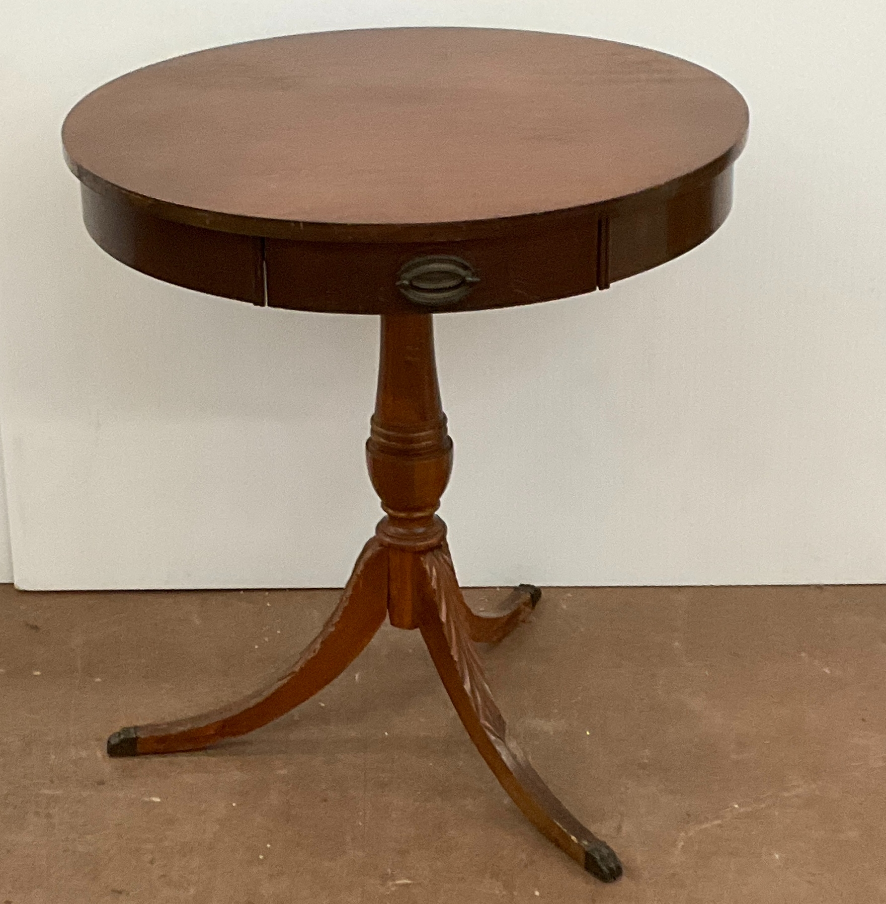 Vintage Mersman Small round wood table with a pedestal base. Features a single drawer with metal hardware. The table has a warm wood finish. 26 x 24 in.