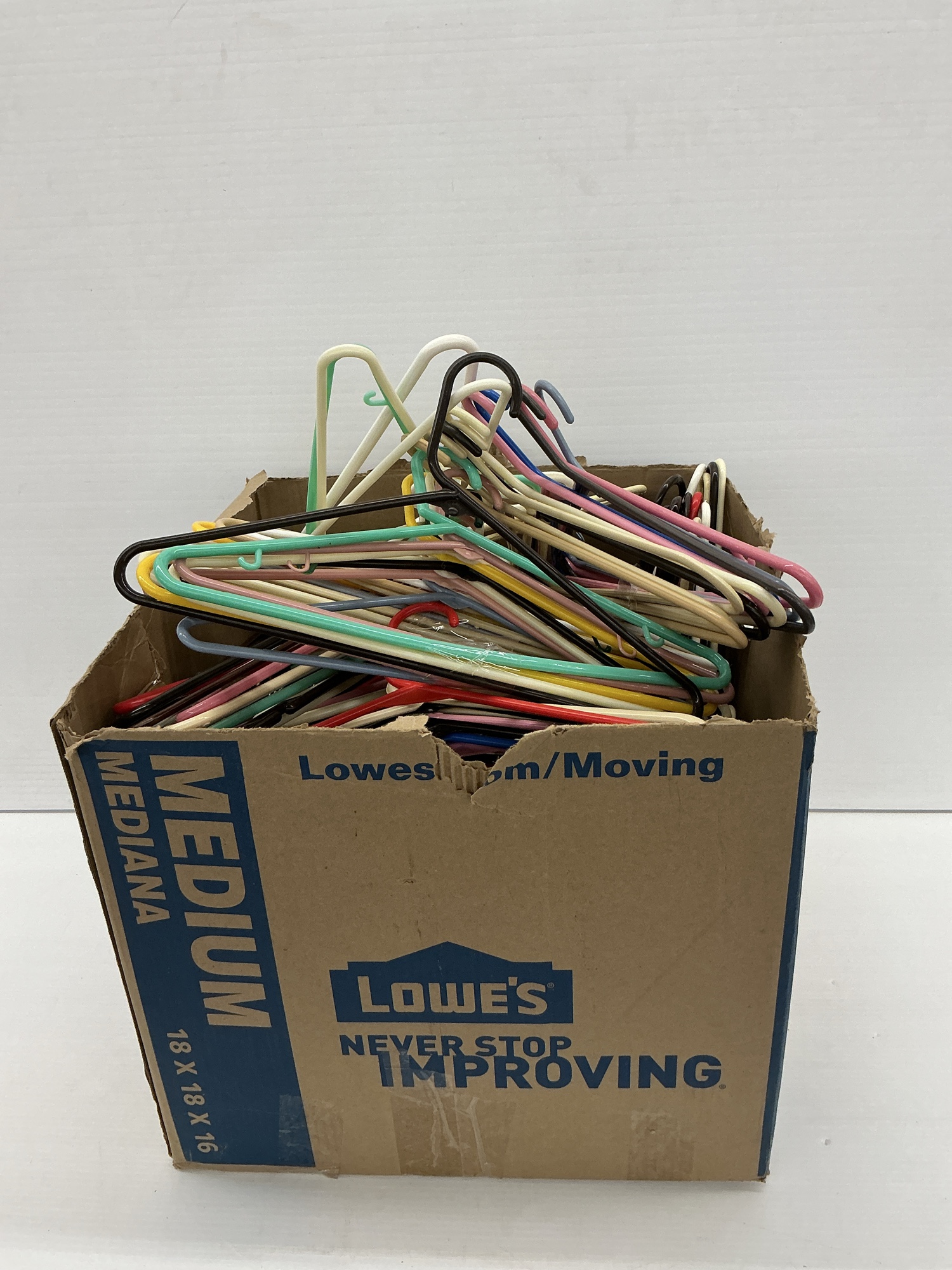 A box filled with assorted clothing hangers. This includes a variety of styles and colors.