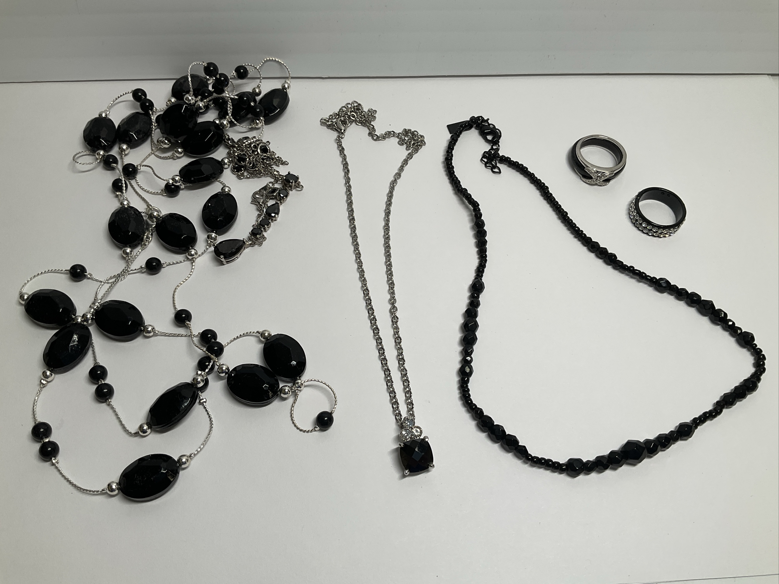 This lot includes a variety of jewelry pieces, including a long multi-strand beaded necklace, a pendant necklace, and two rings sizes 6 & 6.5.