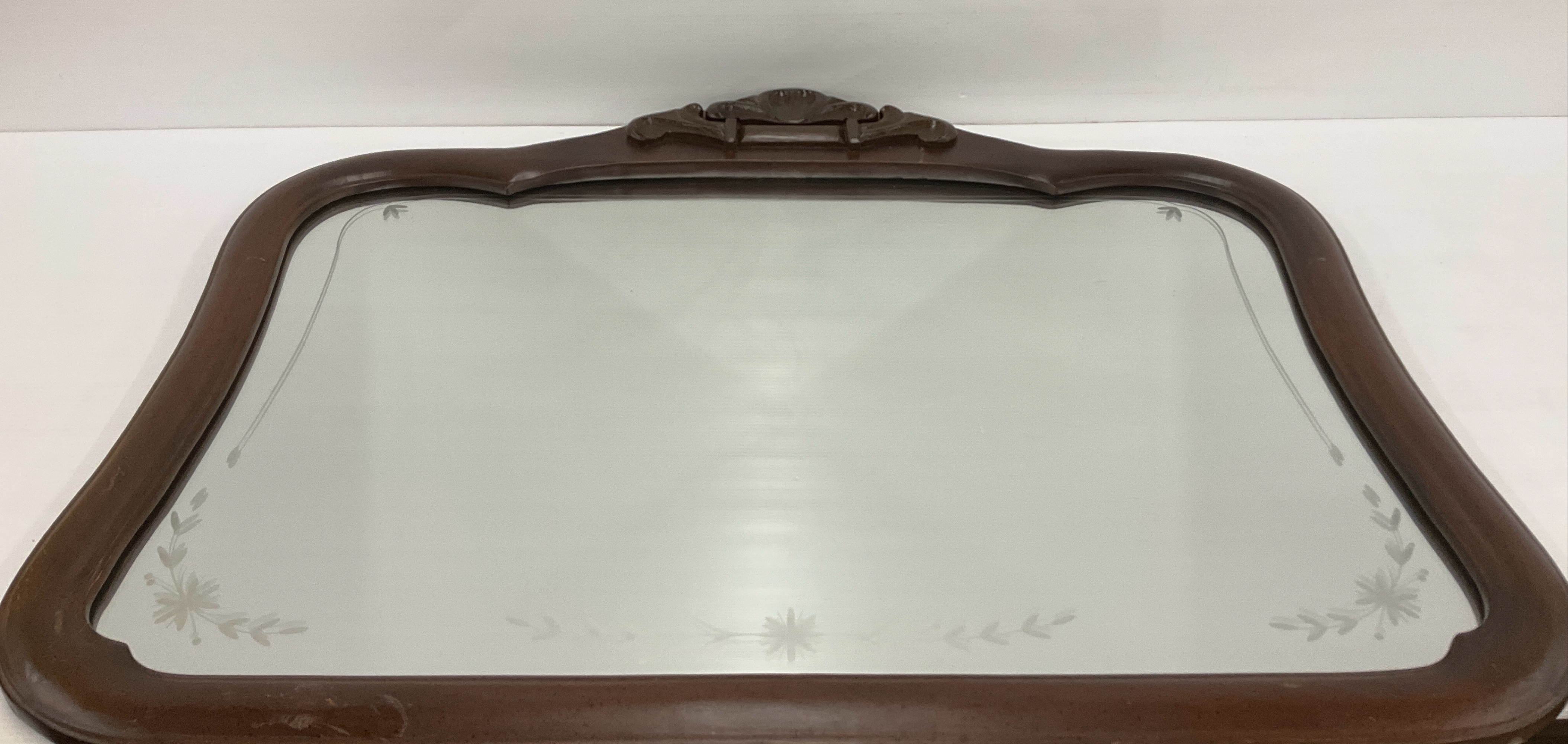 This listing features a wood-framed mirror with etched floral decorations around the glass. The frame has a unique shape and design, along with decorative details at the top. 31 x 39 in.