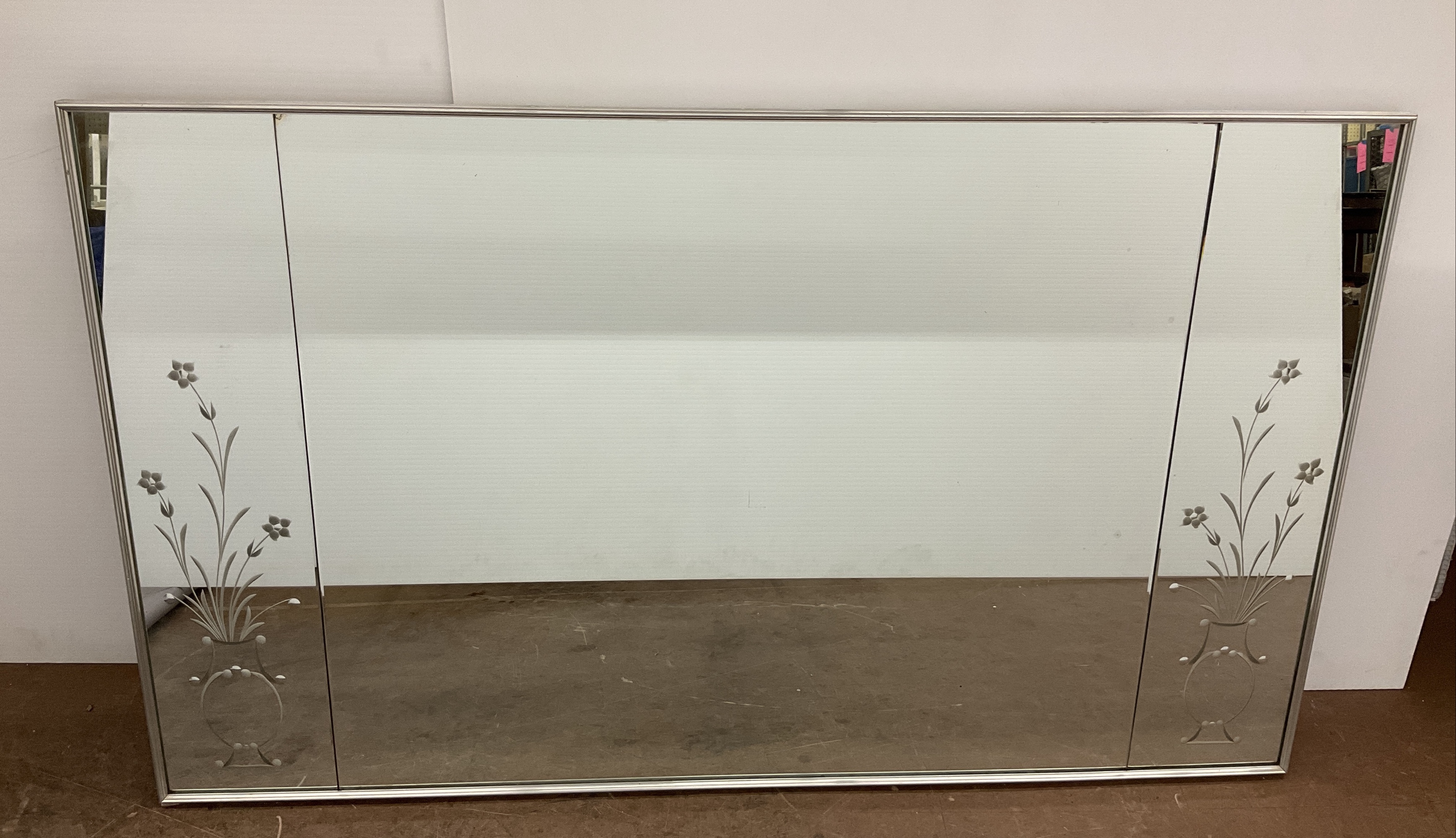 Framed mirror featuring a floral design. The back of the mirror has a label from the Mirror Manufacturers Association dated February 1949. It was made by Hart Mirror Company. 32 x 54 in.