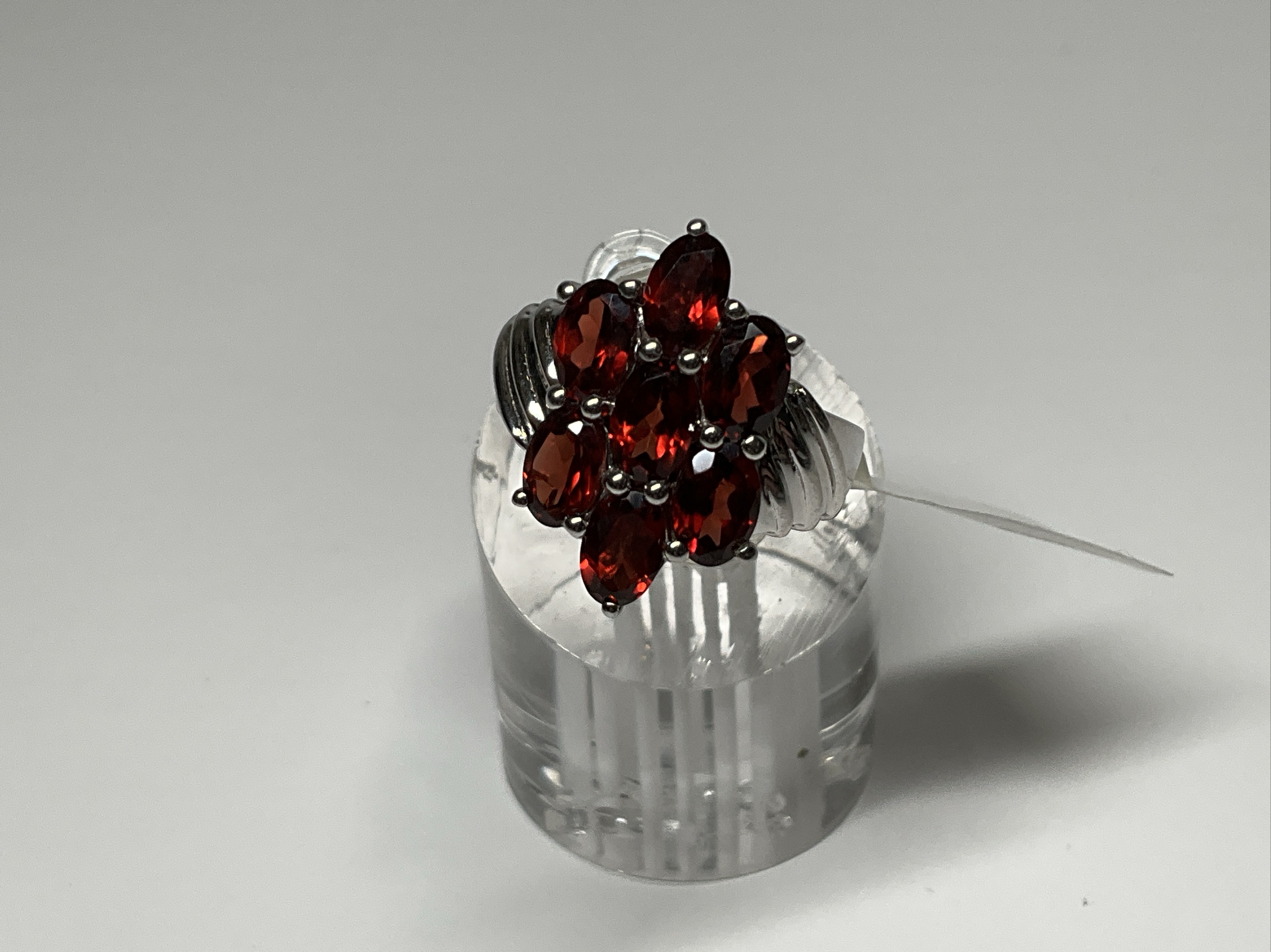 This offering features a sterling silver ring adorned with multiple red gemstones. A beautiful and unique piece. Ring size 5