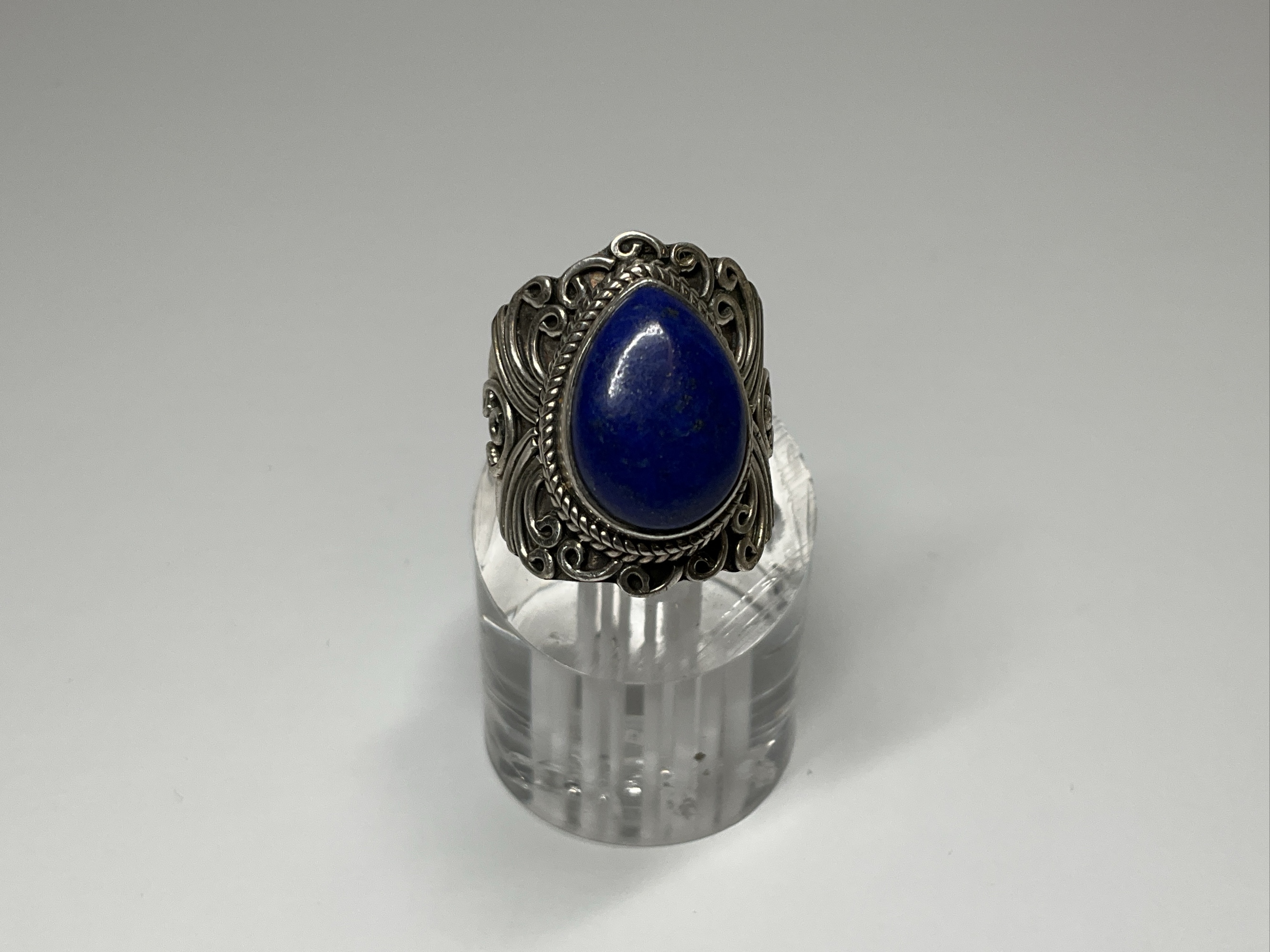 Sterling silver ring featuring a striking blue stone and intricate filigree detailing. Ring size 5