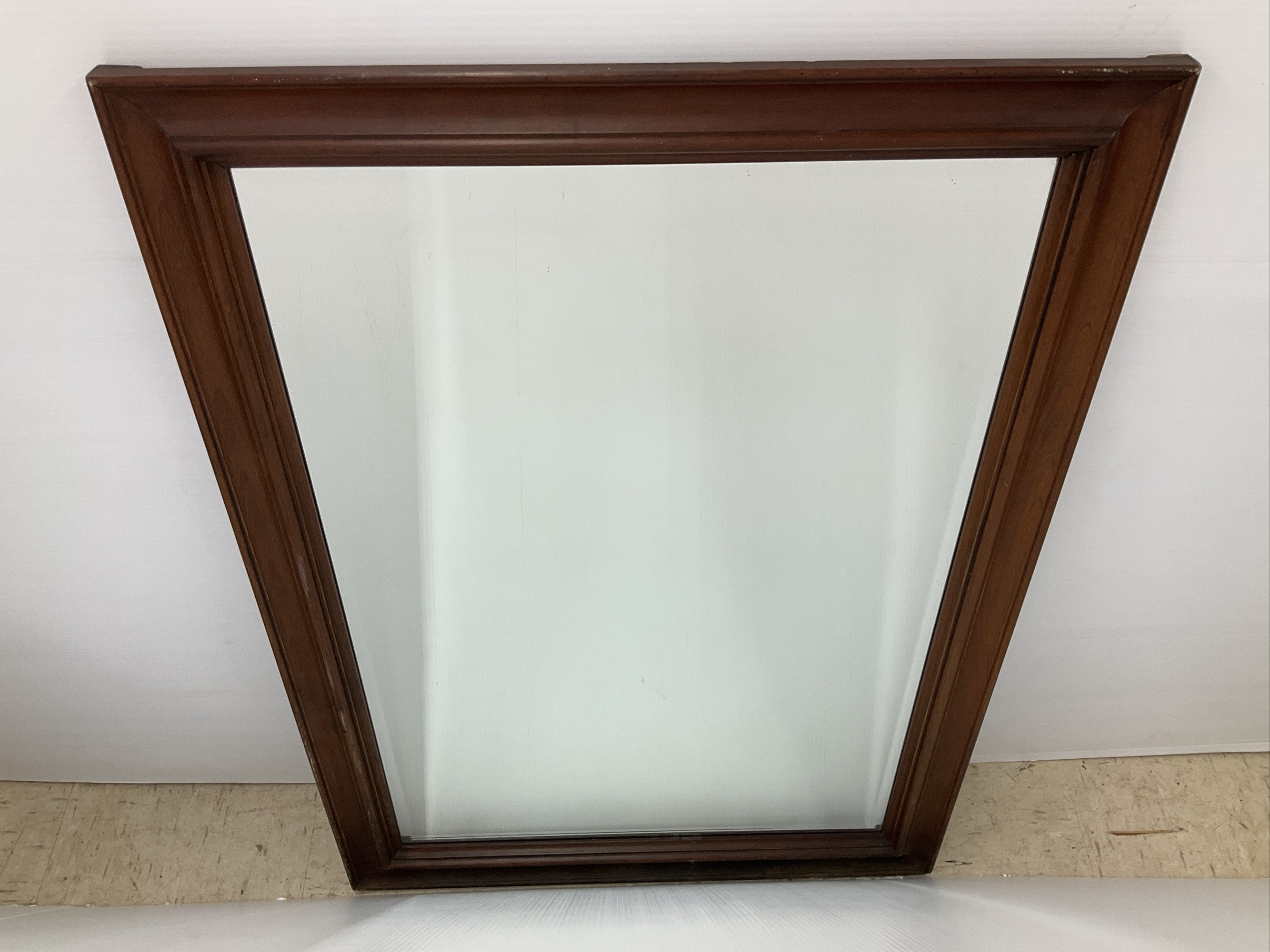 Wall mirror featuring a beveled glass and a dark wooden frame. 36.25 x 20.25 in.