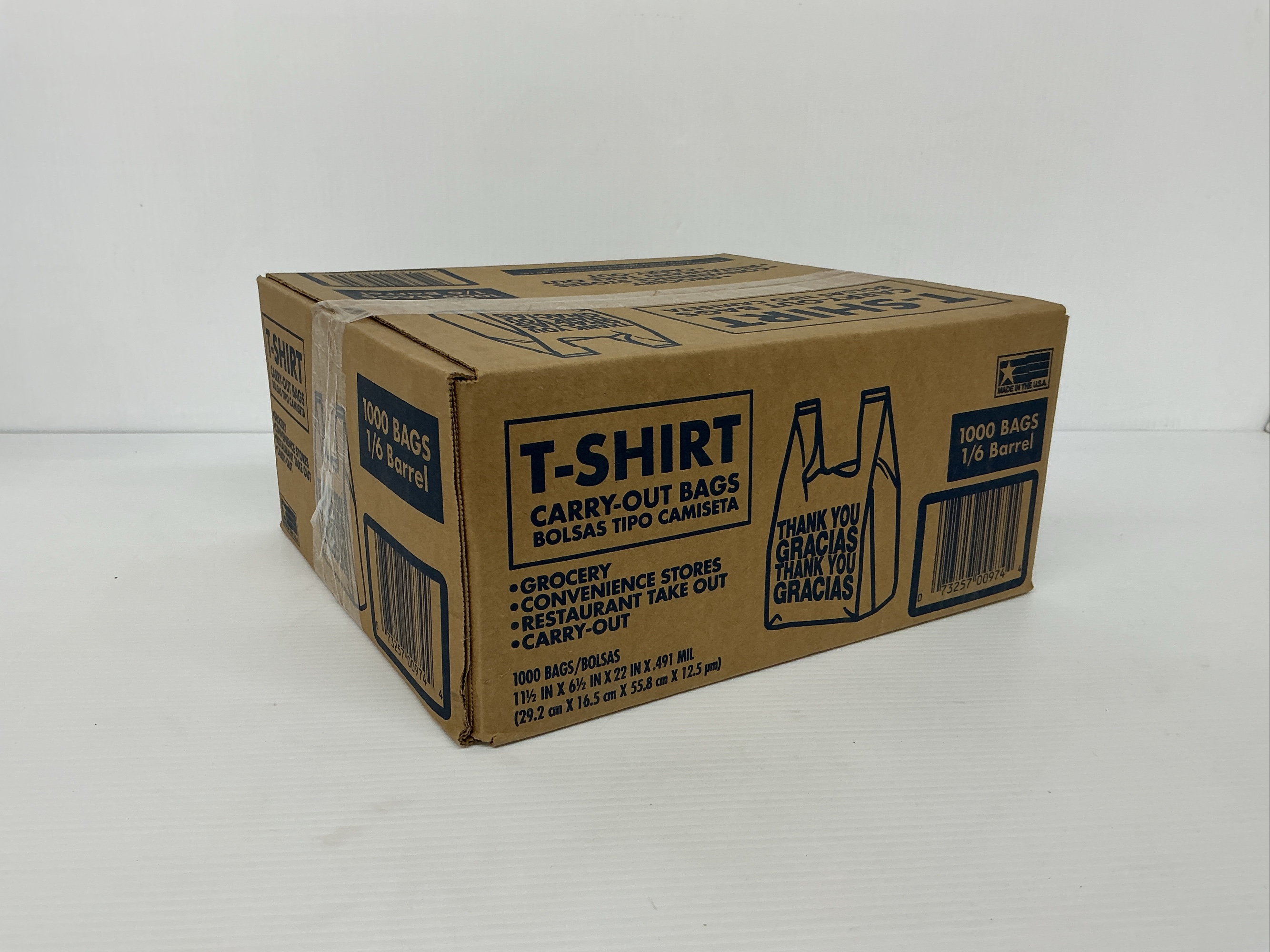 One box of multi use T-shirt shaped carry-out bags. Contains 1000 bags. Bag dimensions are 11-1/2 in. x 6- 1/2 in. x 22 in.
