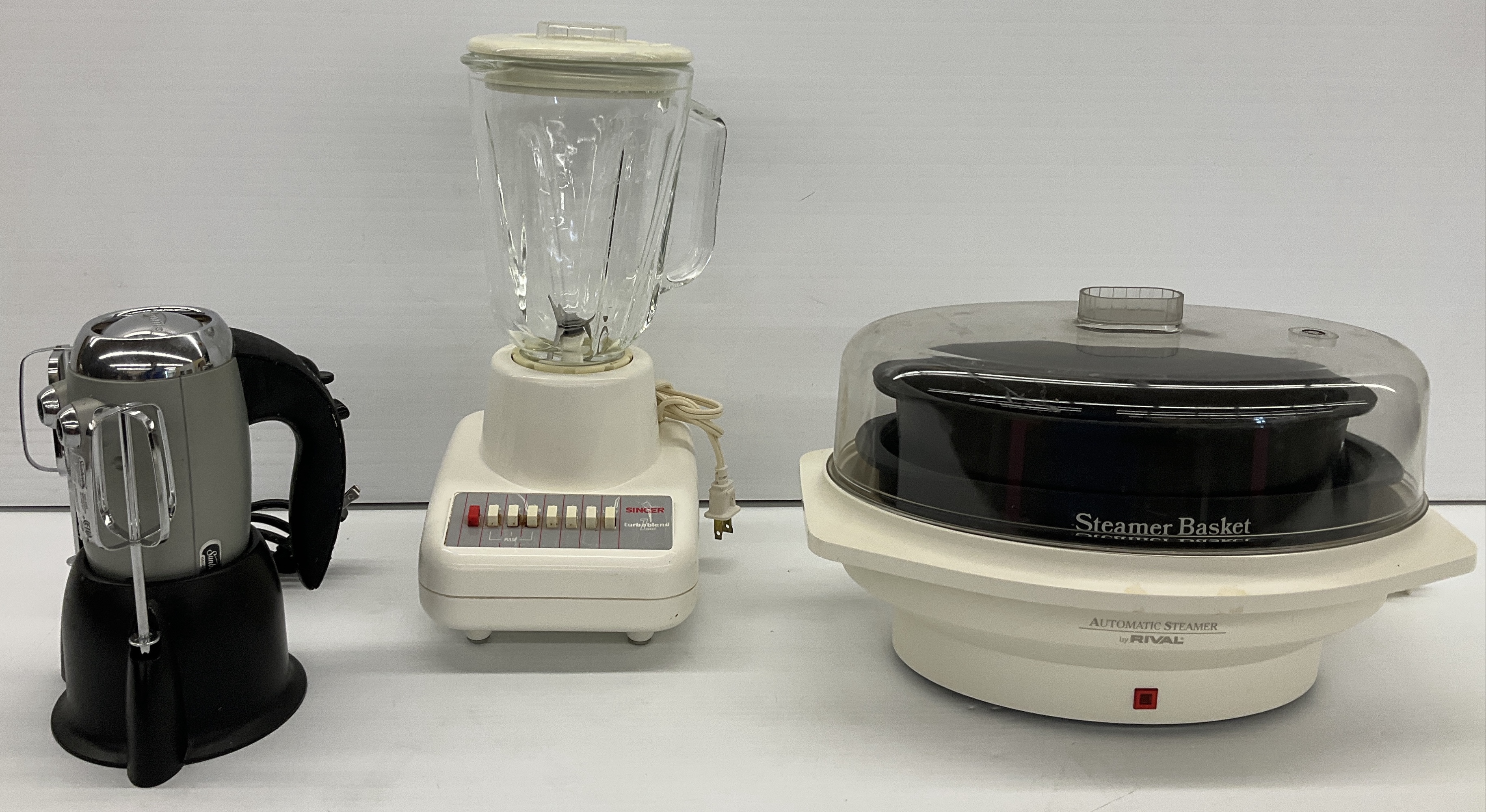 This lot includes a Sunbeam hand mixer, a Singer blender model 731B and a Rival automatic steamer. Please review the images for details. Tallest 15 in.
