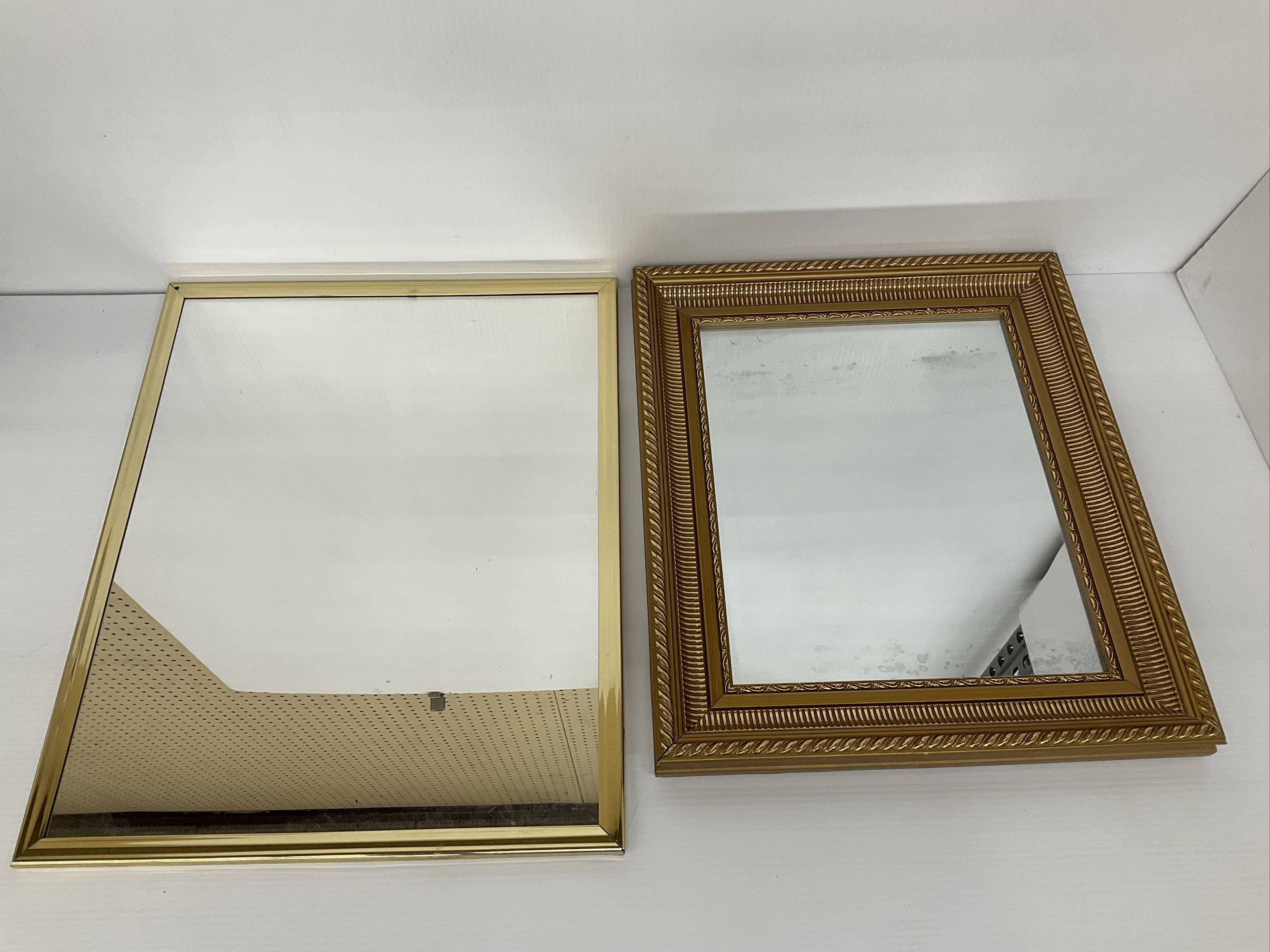 This lot features two mirrors with decorative gold tone frames. One mirror features a simple, sleek frame and the other features a more ornate frame. Largest 20 x 16 in.
