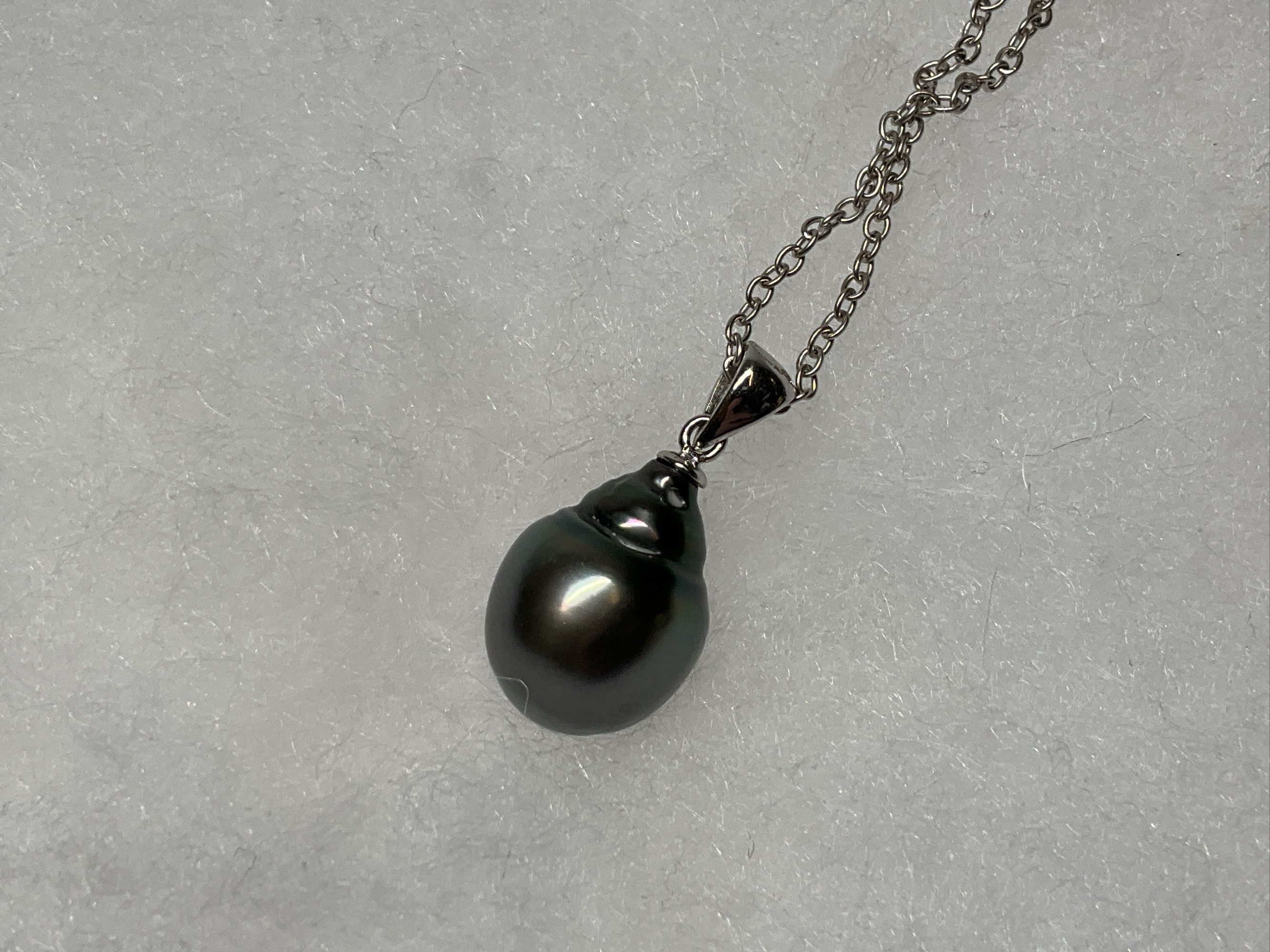 Ready for bidding - this stylish sterling silver necklace with a baroque pearl pendant. The pearl has a unique, irregular shape. The pendant is attached to a delicate chain.
