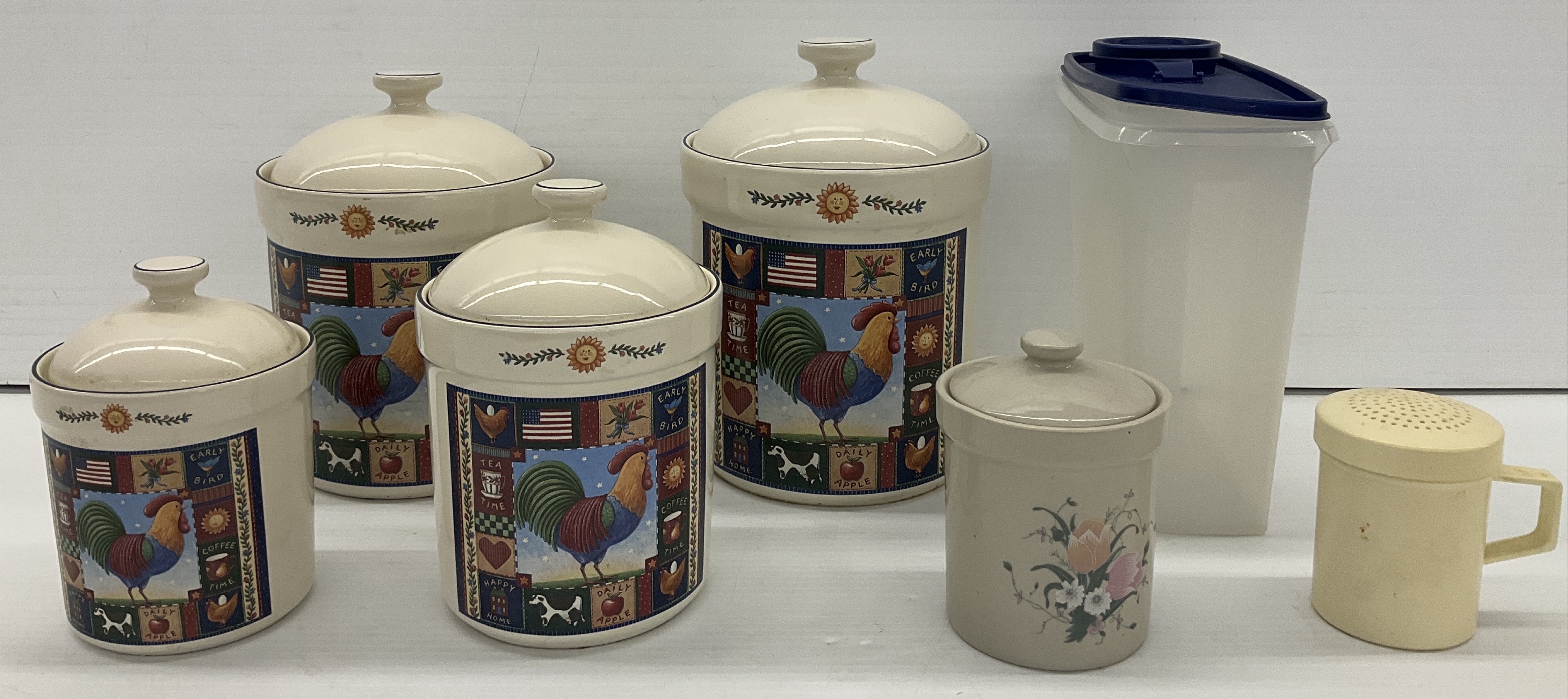 Assorted kitchenware including a set of Coco Dowley rooster-themed canisters, a floral canister, a Tupperware container, and a shaker. Tallest 9 in.