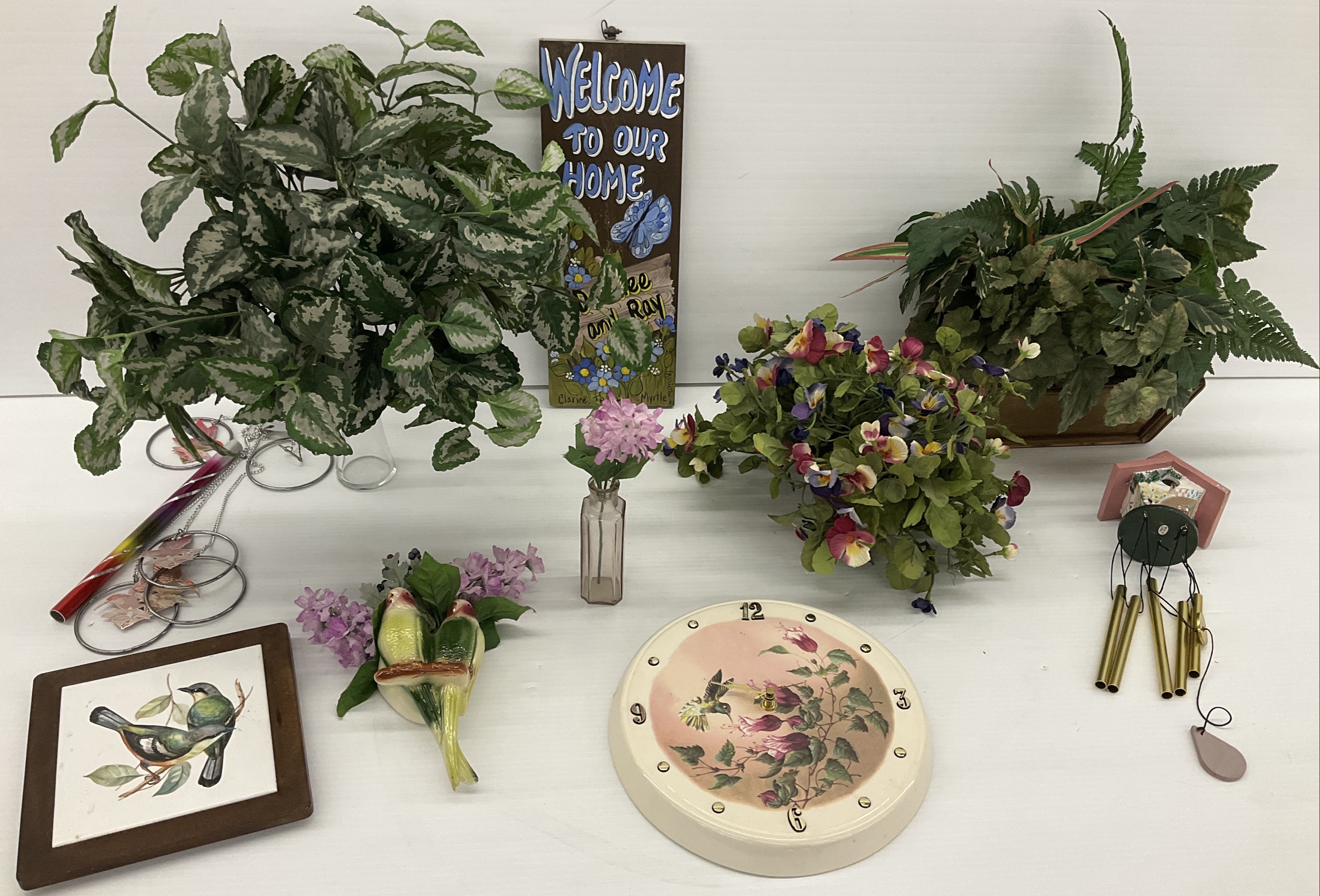 This lot includes a variety of home decor items such as faux floral arrangements, a bird themed wall clock, a wall hanging 'welcome to our home' sign, decorative bird figurines, a framed bird tile, a birdhouse wind chime, an etched glass vase and a hanging bird mobile. Largest 14.75 x 5.5 in.