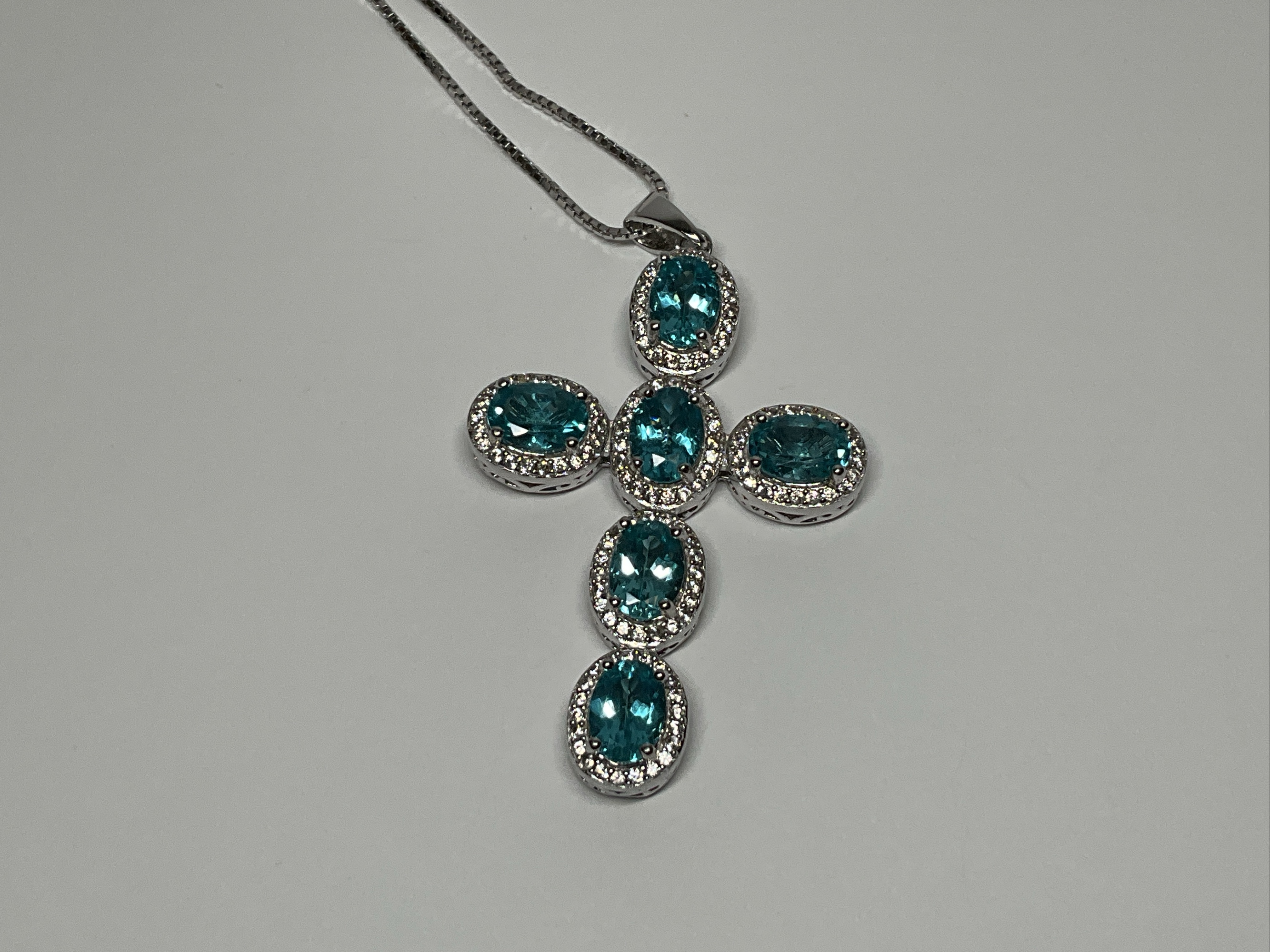 This lot features a sterling silver cross pendant necklace. The cross is adorned with oval-cut blue stones, each surrounded by smaller clear stones, creating a beautiful and eye-catching design. Includes box.