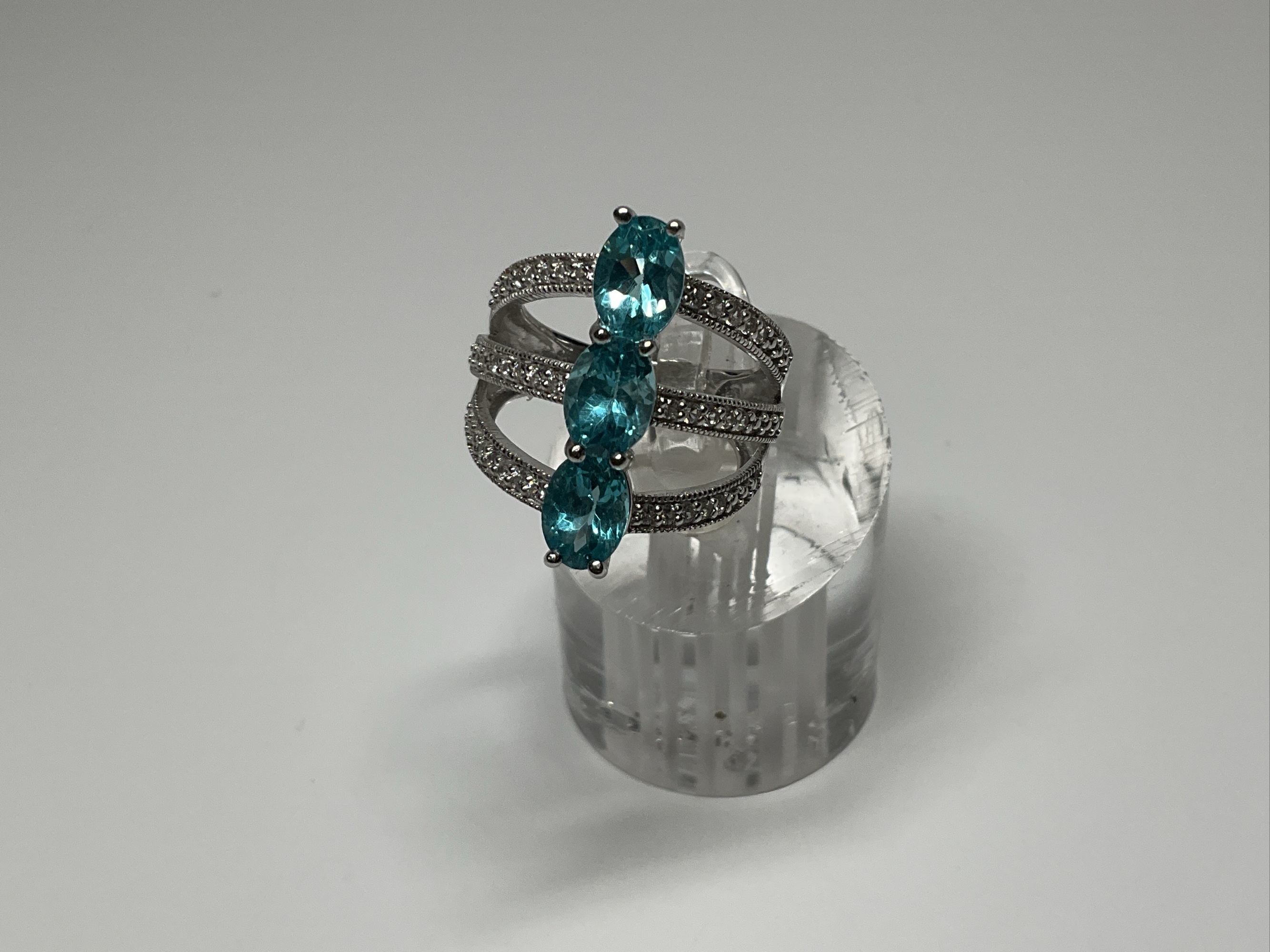 Stunning sterling silver size 5 ring featuring three oval cut aqua color stones set vertically. The ring has a split shank design, each band is embellished with pave set stones to add an extra sparkle. A truly elegant piece of jewelry.